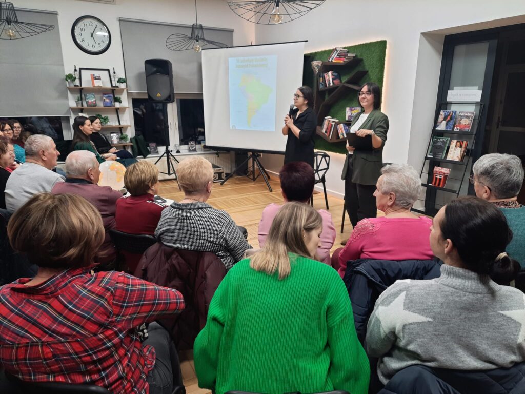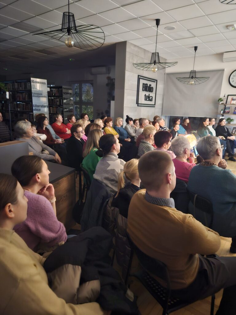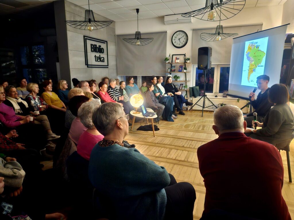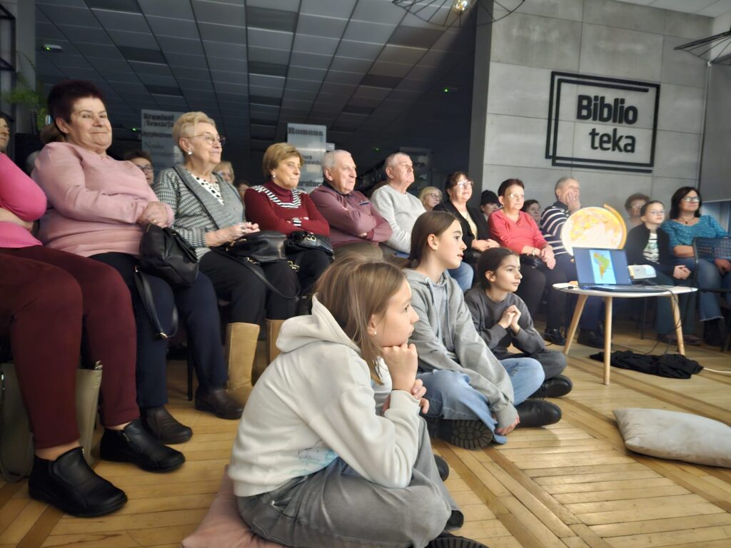 Biblioteka wypełniona była po brzegi – uczestnicy chłonęli fascynujące historie, oglądali zdjęcia, pamiątki i inspirujące anegdoty z wyprawy. 🌍📸