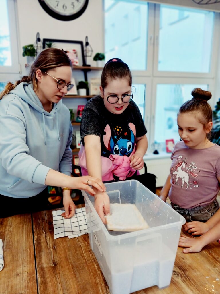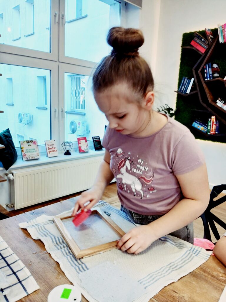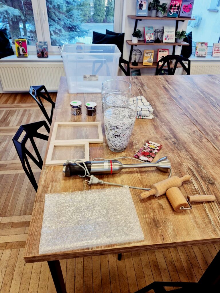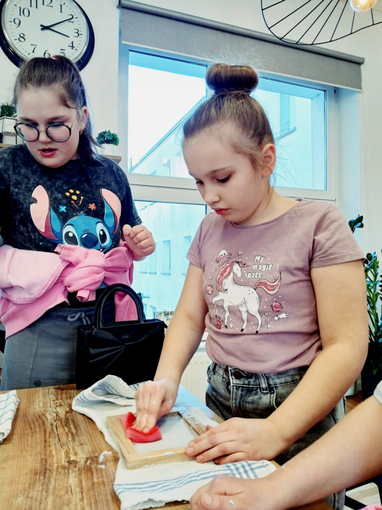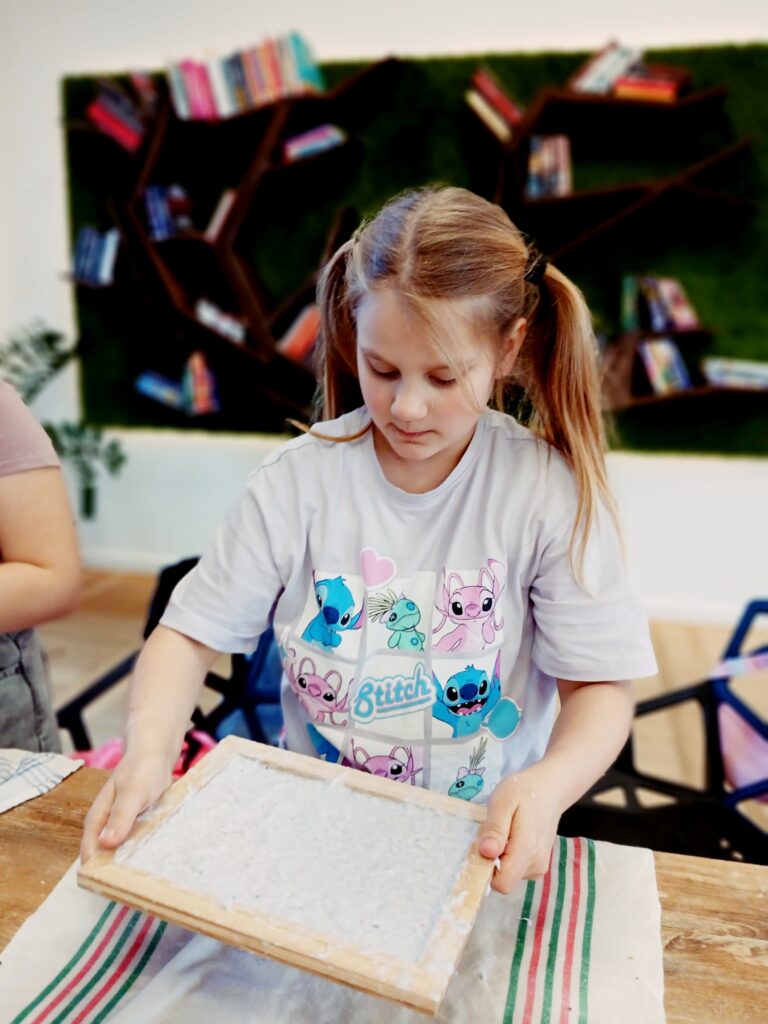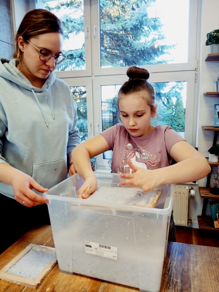 Wczoraj podczas warsztatów z papieru czerpanego uczestniczki dowiedziały się, jak powstaje taki papier, a następnie same stworzyły własne kartki, używając wodnej zawiesiny włókien celulozowych, specjalnych ramek z sitem oraz prasy z tkaniny i wałka.