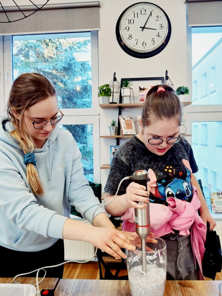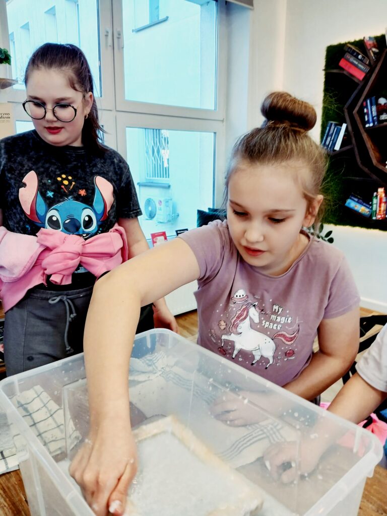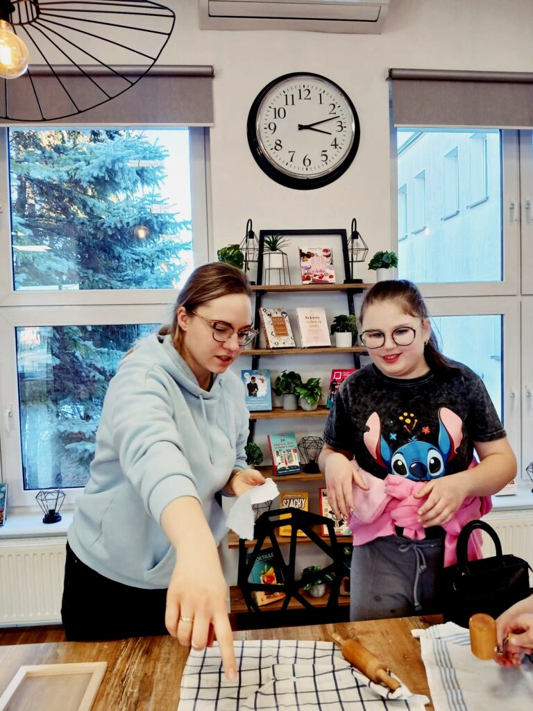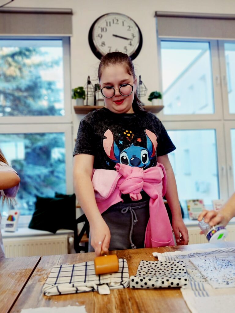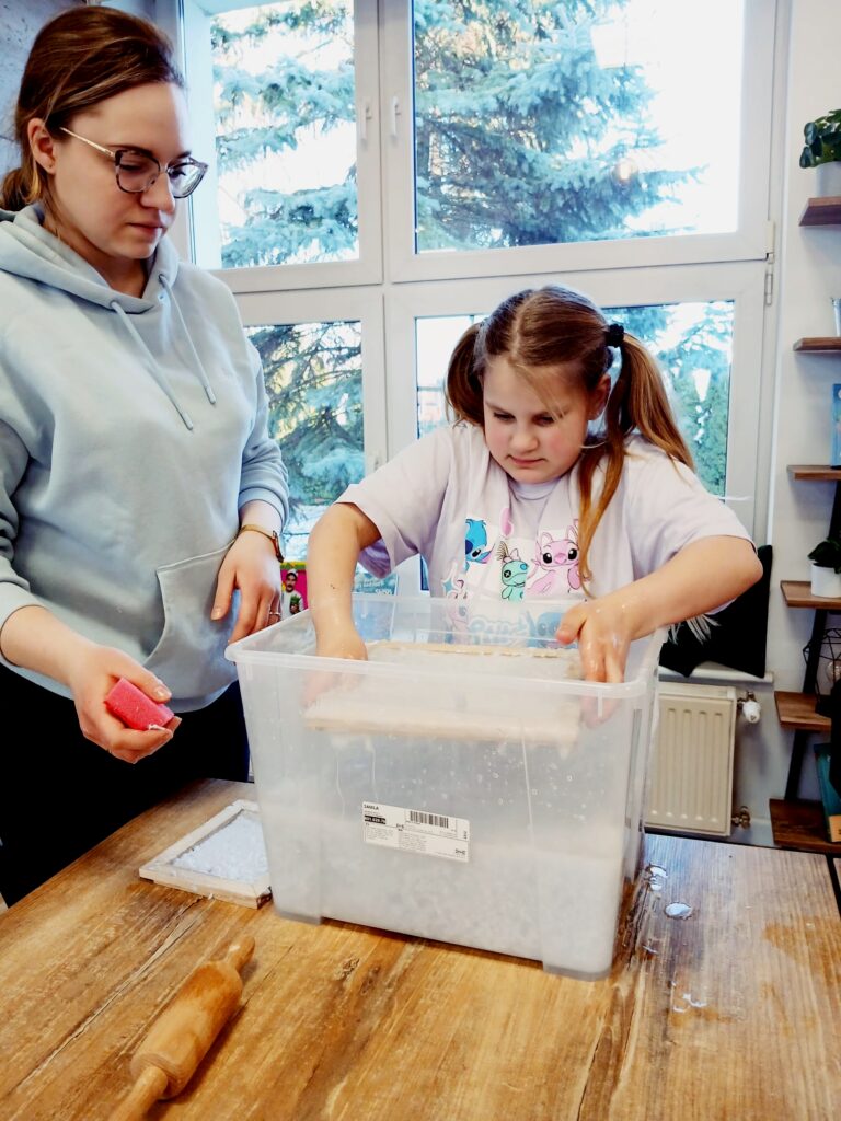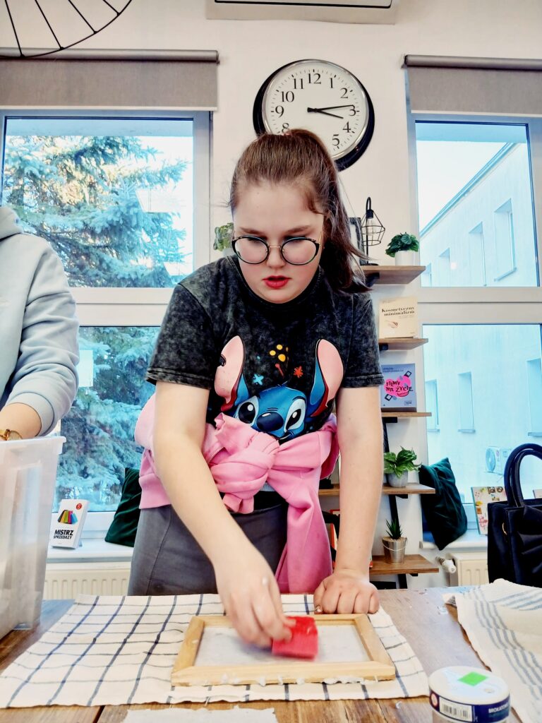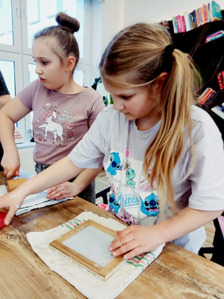 Wczoraj podczas warsztatów z papieru czerpanego uczestniczki dowiedziały się, jak powstaje taki papier, a następnie same stworzyły własne kartki, używając wodnej zawiesiny włókien celulozowych, specjalnych ramek z sitem oraz prasy z tkaniny i wałka.