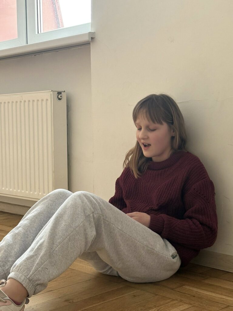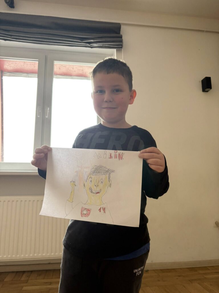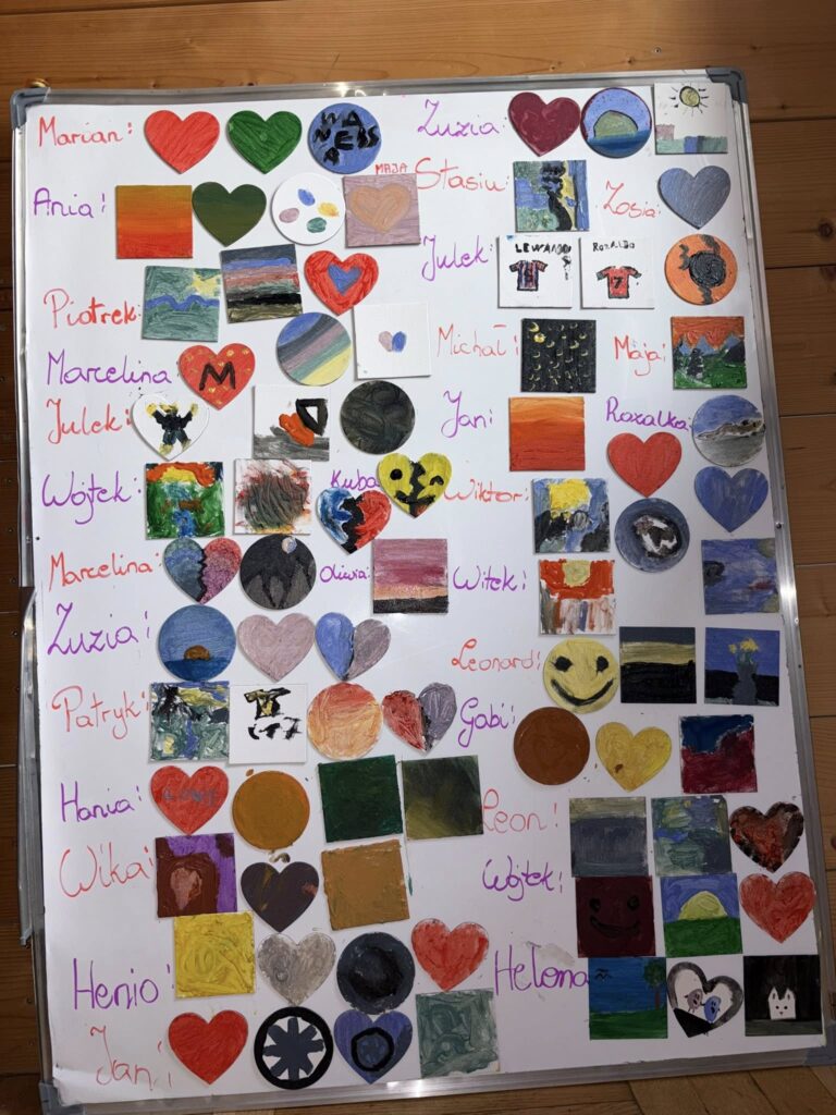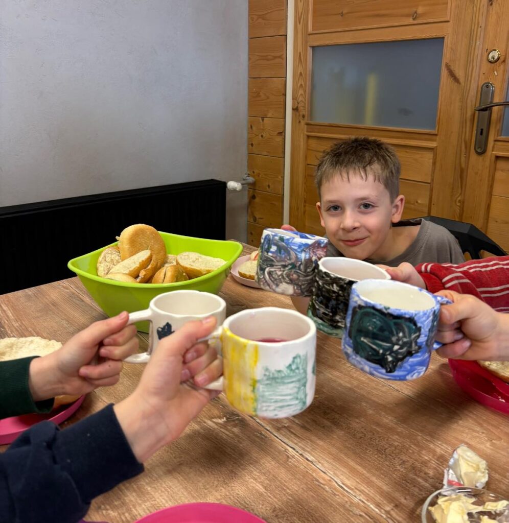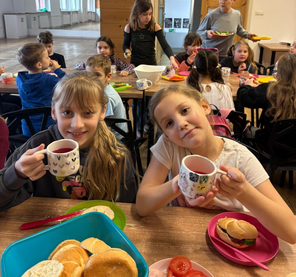 Dzień zaczęliśmy od wspólnej zabawy, która wprawiła wszystkich w świetny nastrój. Po niej zasiedliśmy do śniadania i z dumą korzystaliśmy z kubków, które malowaliśmy wczoraj – smakowało jeszcze lepiej!