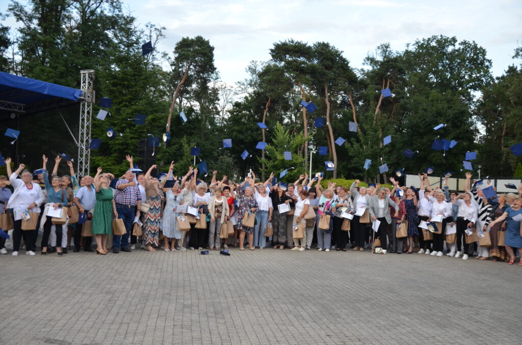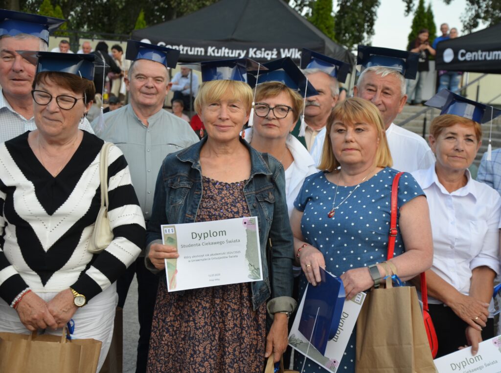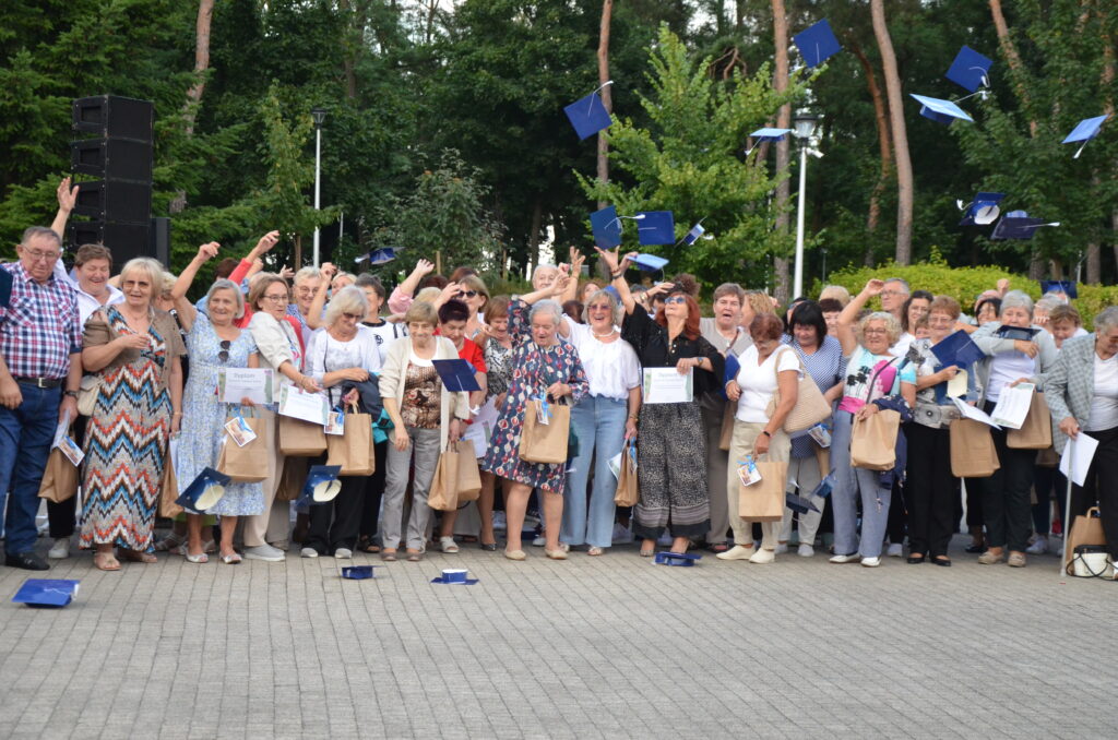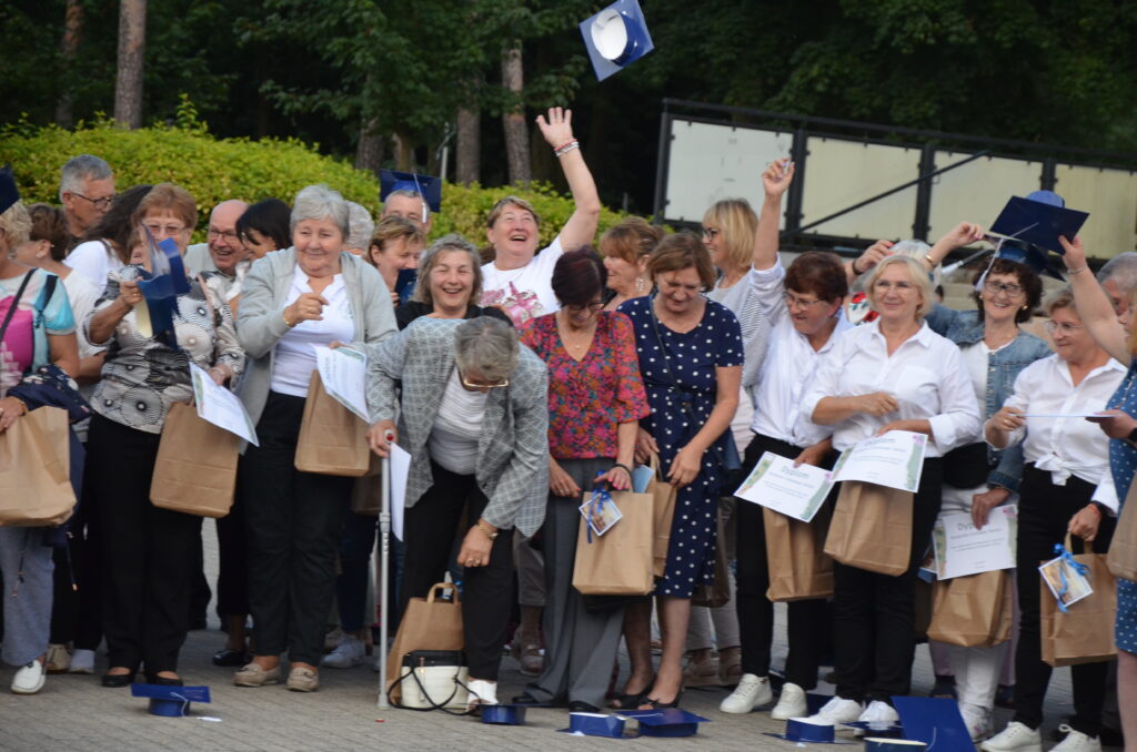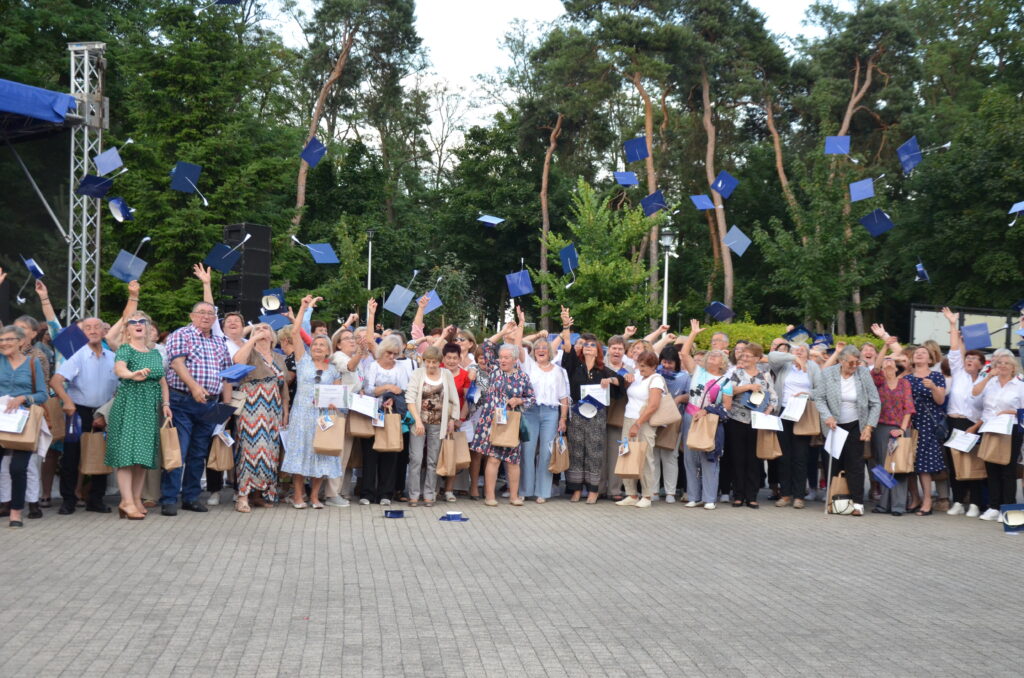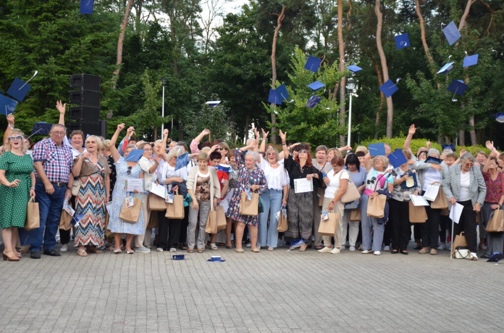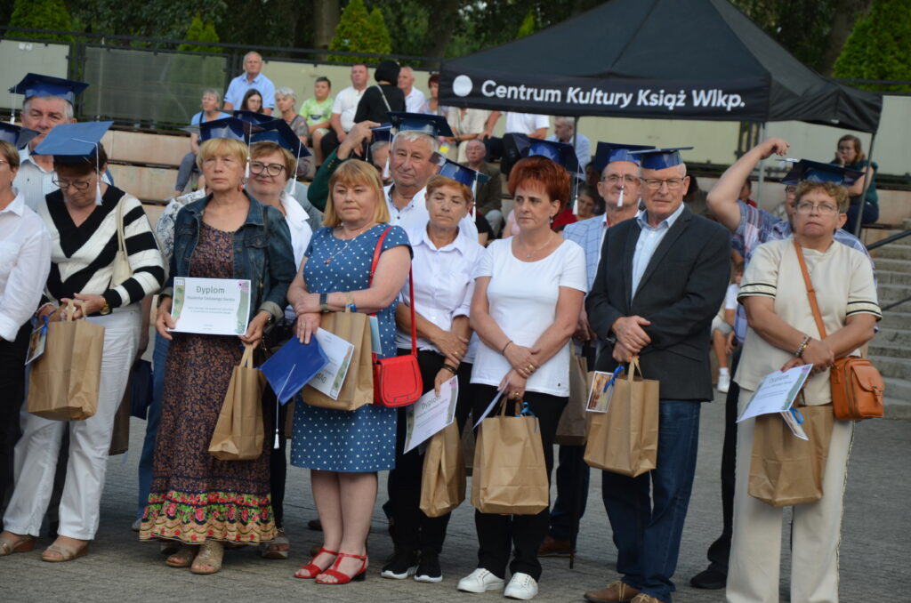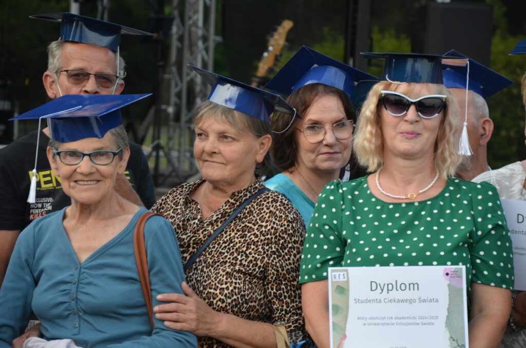 Entuzjaści Świata zakończyli naukę w Uniwersytecie Entuzjastów Świata! Wczoraj (13.07) w ksiąskim Amfiteatrze odbyło się uroczyste podsumowanie roku akademickiego 2024/2025. Prezes stowarzyszenia Anna Kaczmarek przejrzała indeksy i „zaliczyła” studentom kolejny etap edukacji 😉. Bohaterowie tego wydarzenia (których było ponad 100!), poprowadzonego przez Mariolę Kaźmierczak, dyrektora Centrum Kultury, otrzymali również gratulacje od „wicerektor” Mireli Grześkowiak, zastępcy burmistrza Książa Wlkp. oraz od Anny Ślipko-Rewers, kierownika Ośrodka Pomocy Społecznej w Książu Wlkp. Ta ostatnia wspomniała również o różnych możliwościach wsparcia dla seniorów ze strony zarządzanej przez nią instytucji. Tradycyjnie już Entuzjaści Świata otrzymali dyplomy, drobne upominki i birety, które poszybowały w góry w rytm muzyki przygrywanej przez Amigo Band.