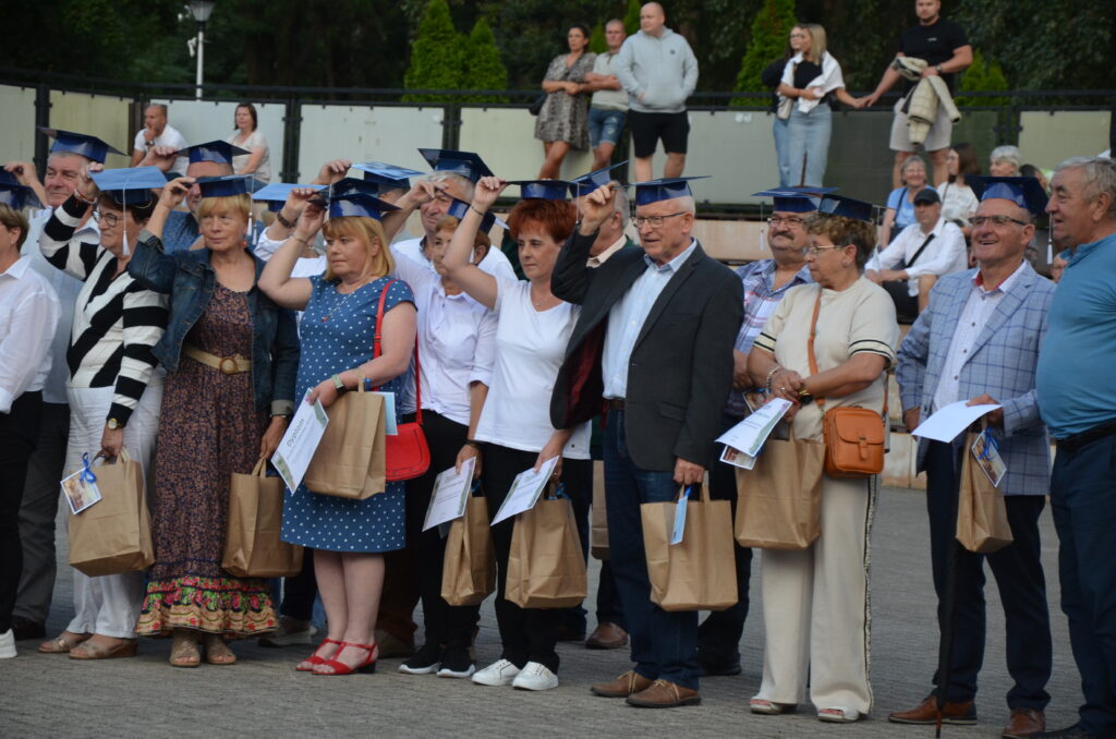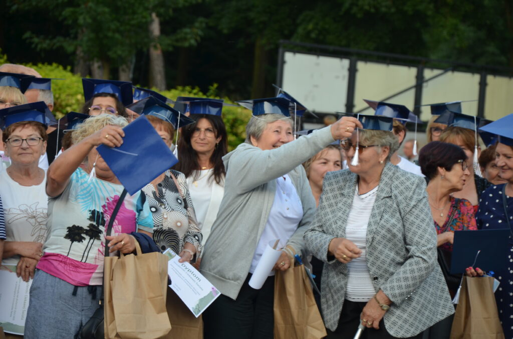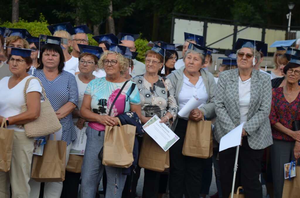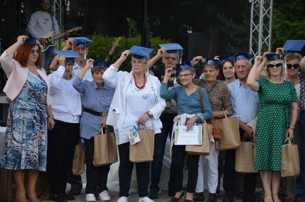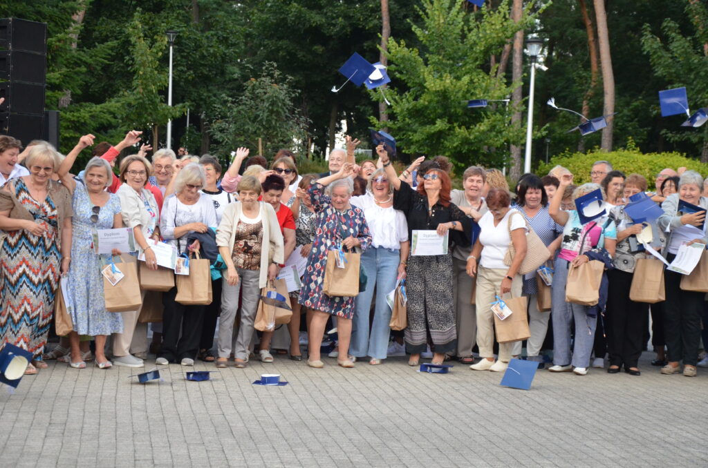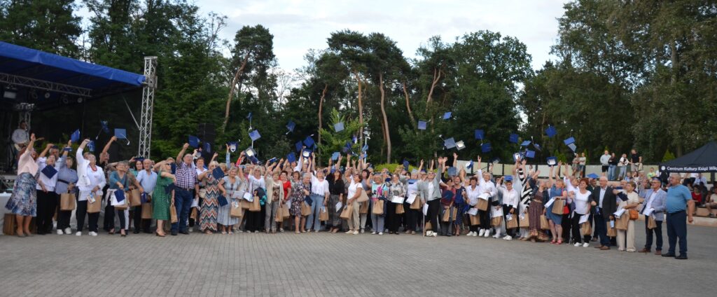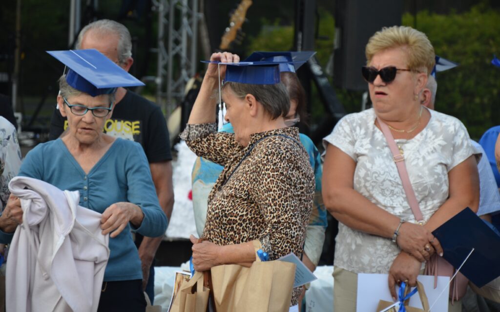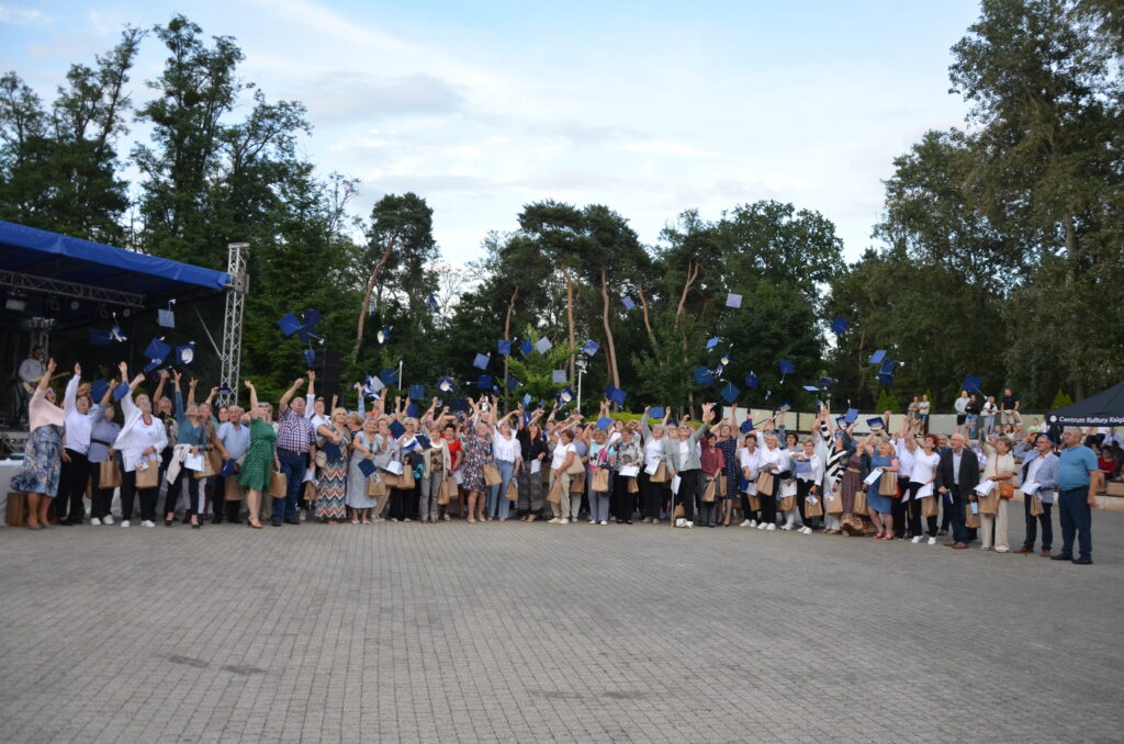 Entuzjaści Świata zakończyli naukę w Uniwersytecie Entuzjastów Świata! Wczoraj (13.07) w ksiąskim Amfiteatrze odbyło się uroczyste podsumowanie roku akademickiego 2024/2025. Prezes stowarzyszenia Anna Kaczmarek przejrzała indeksy i „zaliczyła” studentom kolejny etap edukacji 😉. Bohaterowie tego wydarzenia (których było ponad 100!), poprowadzonego przez Mariolę Kaźmierczak, dyrektora Centrum Kultury, otrzymali również gratulacje od „wicerektor” Mireli Grześkowiak, zastępcy burmistrza Książa Wlkp. oraz od Anny Ślipko-Rewers, kierownika Ośrodka Pomocy Społecznej w Książu Wlkp. Ta ostatnia wspomniała również o różnych możliwościach wsparcia dla seniorów ze strony zarządzanej przez nią instytucji. Tradycyjnie już Entuzjaści Świata otrzymali dyplomy, drobne upominki i birety, które poszybowały w góry w rytm muzyki przygrywanej przez Amigo Band.