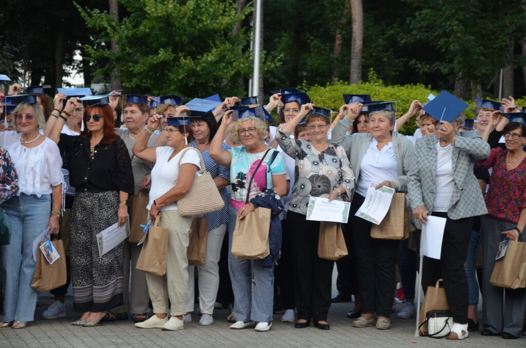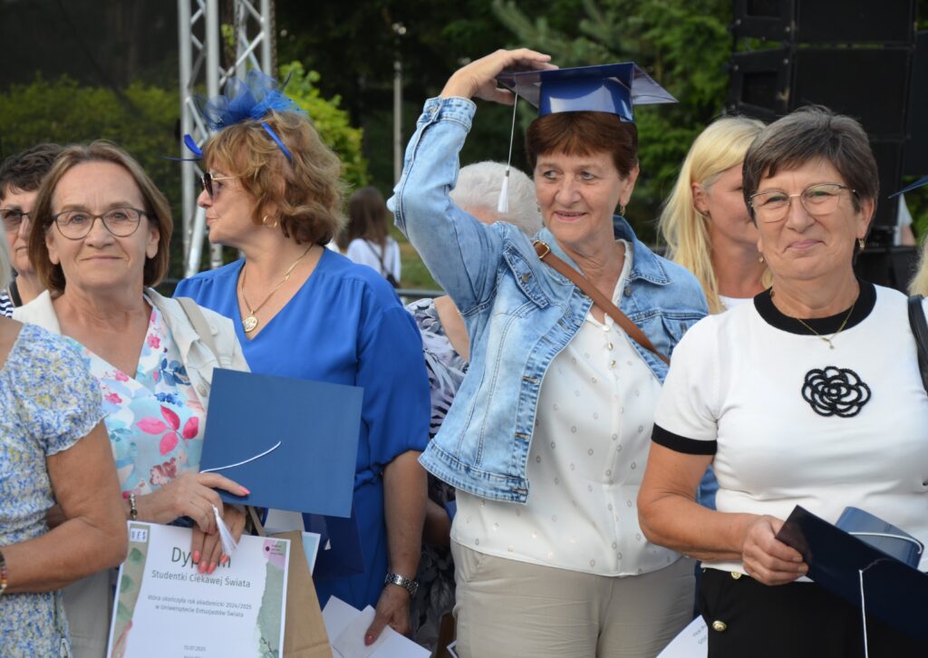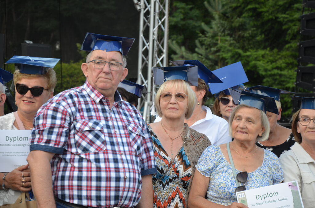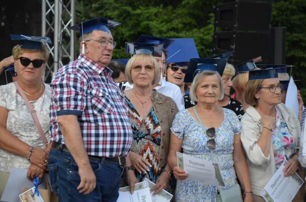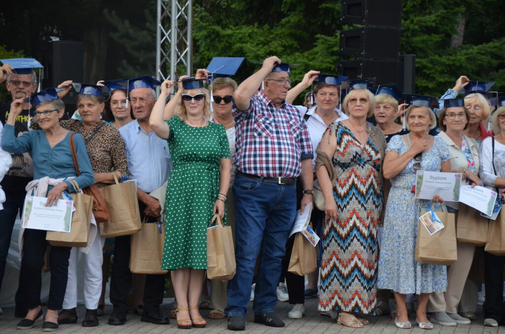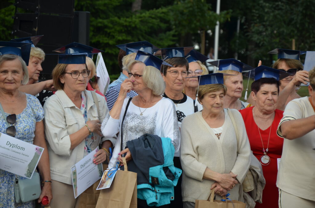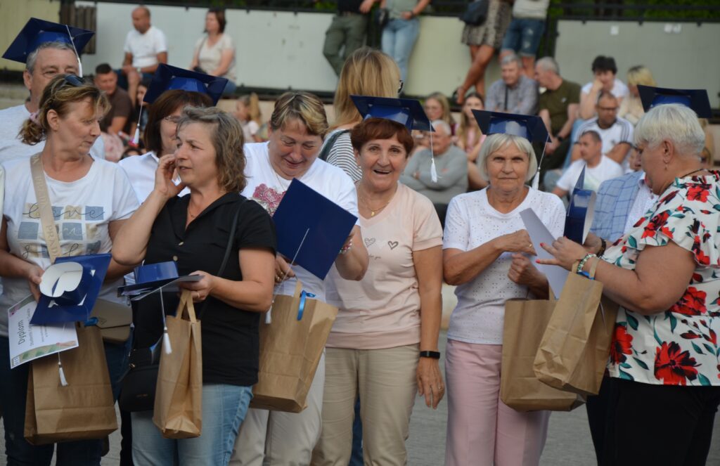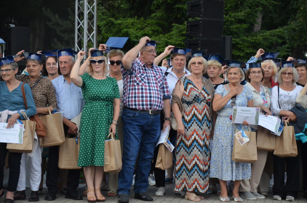 Entuzjaści Świata zakończyli naukę w Uniwersytecie Entuzjastów Świata! Wczoraj (13.07) w ksiąskim Amfiteatrze odbyło się uroczyste podsumowanie roku akademickiego 2024/2025. Prezes stowarzyszenia Anna Kaczmarek przejrzała indeksy i „zaliczyła” studentom kolejny etap edukacji 😉. Bohaterowie tego wydarzenia (których było ponad 100!), poprowadzonego przez Mariolę Kaźmierczak, dyrektora Centrum Kultury, otrzymali również gratulacje od „wicerektor” Mireli Grześkowiak, zastępcy burmistrza Książa Wlkp. oraz od Anny Ślipko-Rewers, kierownika Ośrodka Pomocy Społecznej w Książu Wlkp. Ta ostatnia wspomniała również o różnych możliwościach wsparcia dla seniorów ze strony zarządzanej przez nią instytucji. Tradycyjnie już Entuzjaści Świata otrzymali dyplomy, drobne upominki i birety, które poszybowały w góry w rytm muzyki przygrywanej przez Amigo Band.