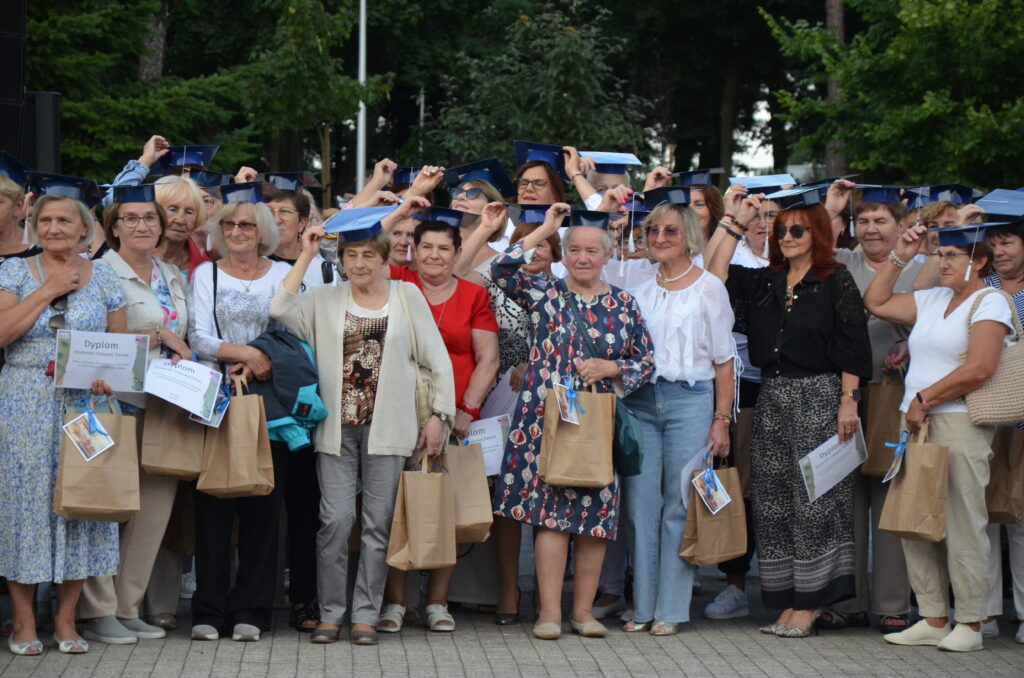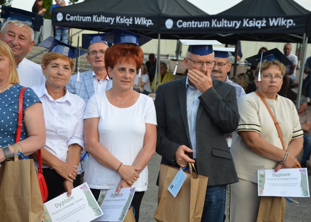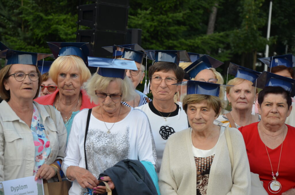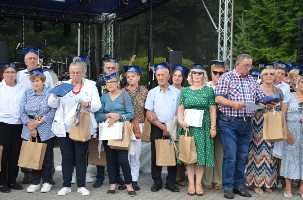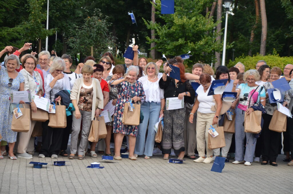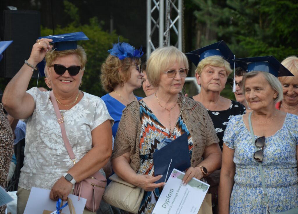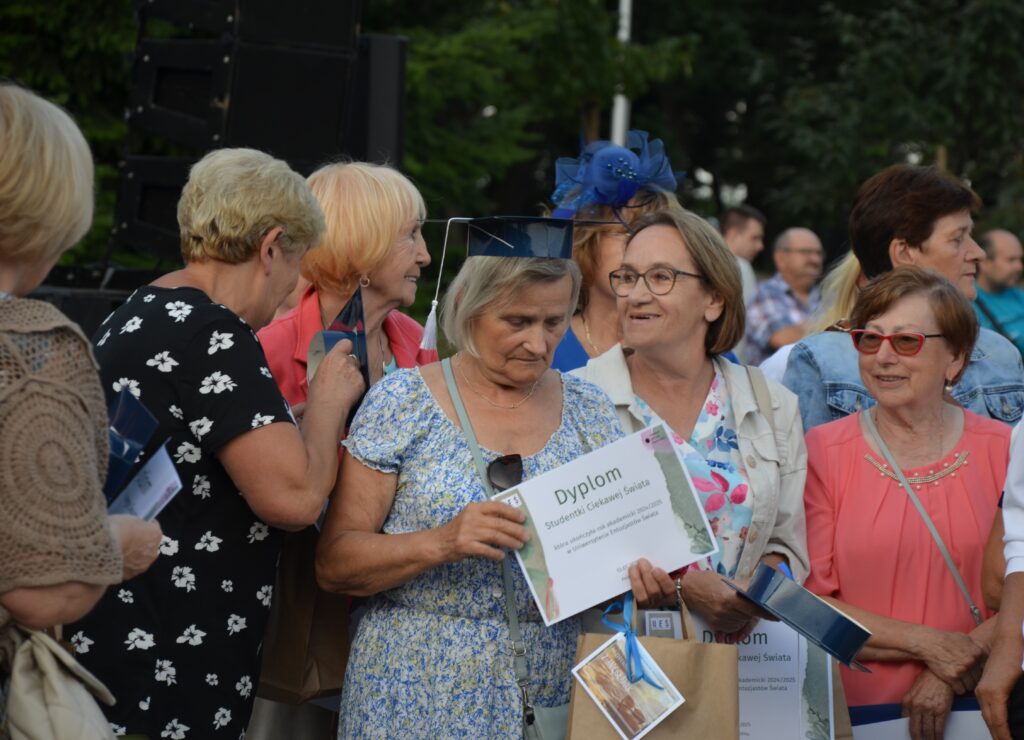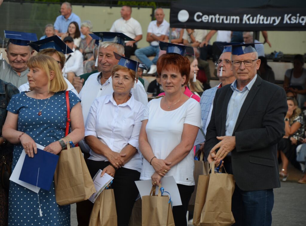Entuzjaści Świata zakończyli naukę w Uniwersytecie Entuzjastów Świata! Wczoraj (13.07) w ksiąskim Amfiteatrze odbyło się uroczyste podsumowanie roku akademickiego 2024/2025. Prezes stowarzyszenia Anna Kaczmarek przejrzała indeksy i „zaliczyła” studentom kolejny etap edukacji 😉. Bohaterowie tego wydarzenia (których było ponad 100!), poprowadzonego przez Mariolę Kaźmierczak, dyrektora Centrum Kultury, otrzymali również gratulacje od „wicerektor” Mireli Grześkowiak, zastępcy burmistrza Książa Wlkp. oraz od Anny Ślipko-Rewers, kierownika Ośrodka Pomocy Społecznej w Książu Wlkp. Ta ostatnia wspomniała również o różnych możliwościach wsparcia dla seniorów ze strony zarządzanej przez nią instytucji. Tradycyjnie już Entuzjaści Świata otrzymali dyplomy, drobne upominki i birety, które poszybowały w góry w rytm muzyki przygrywanej przez Amigo Band.