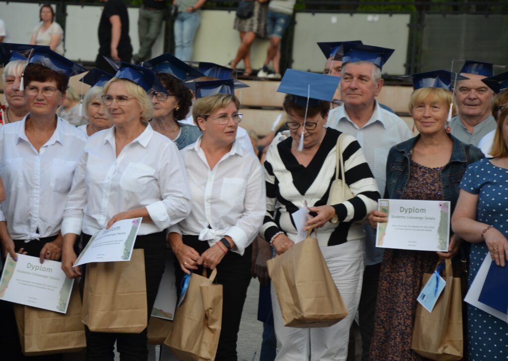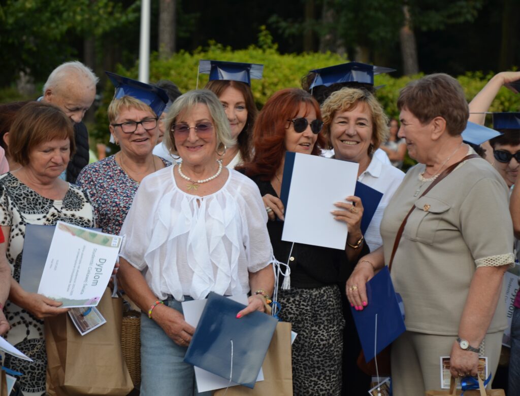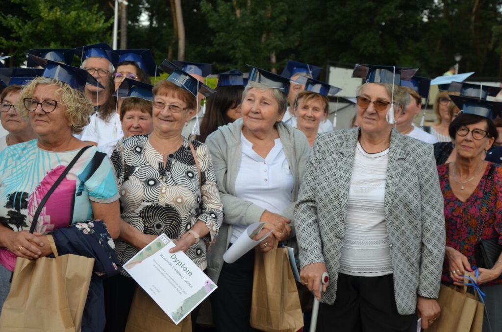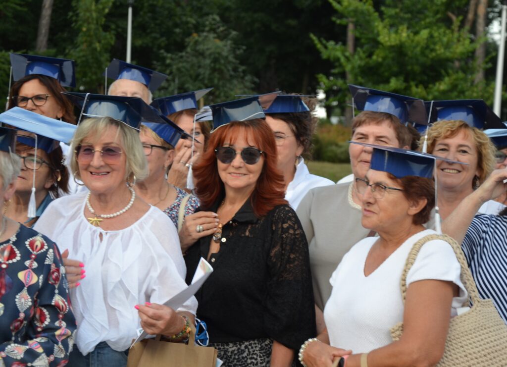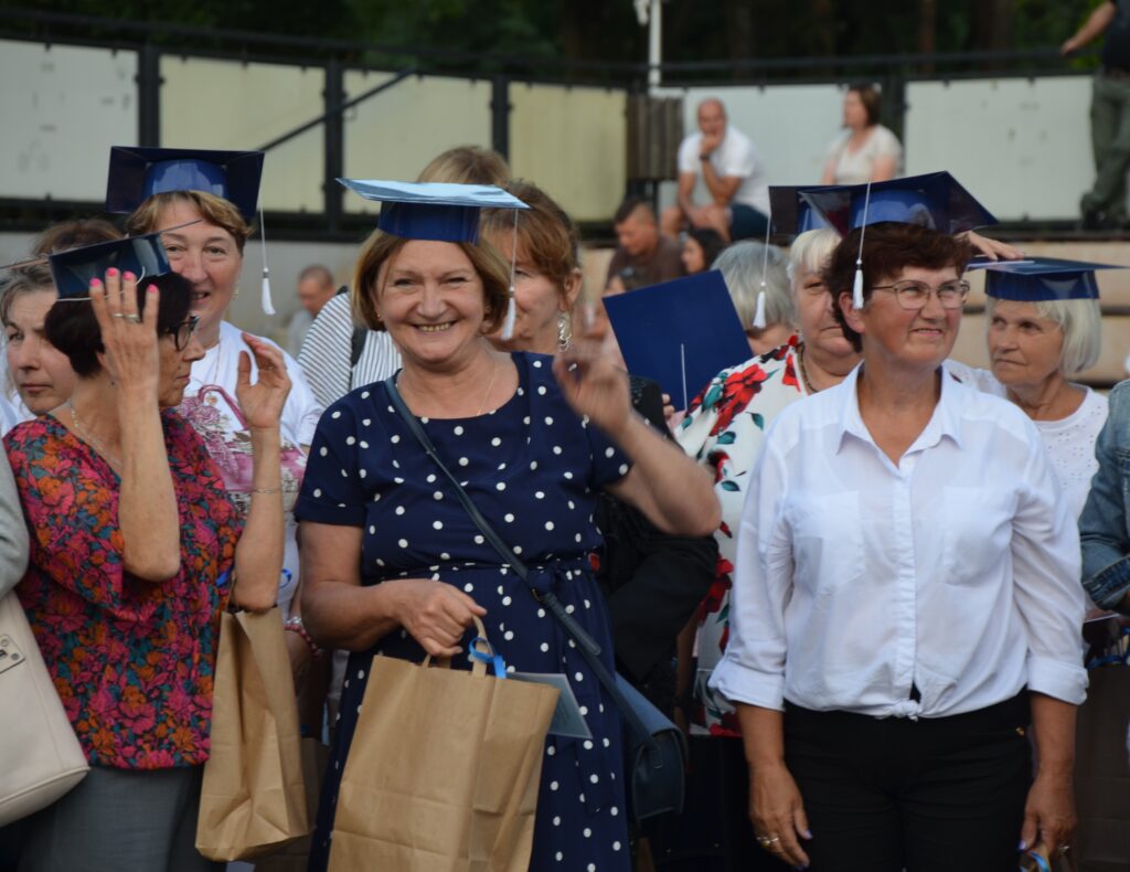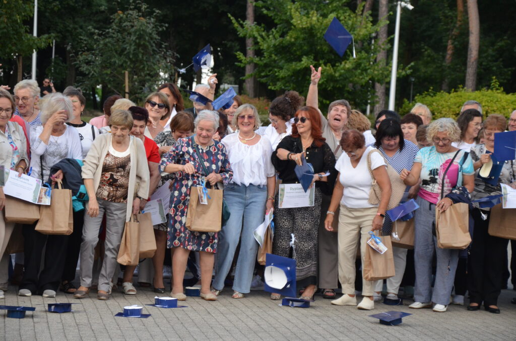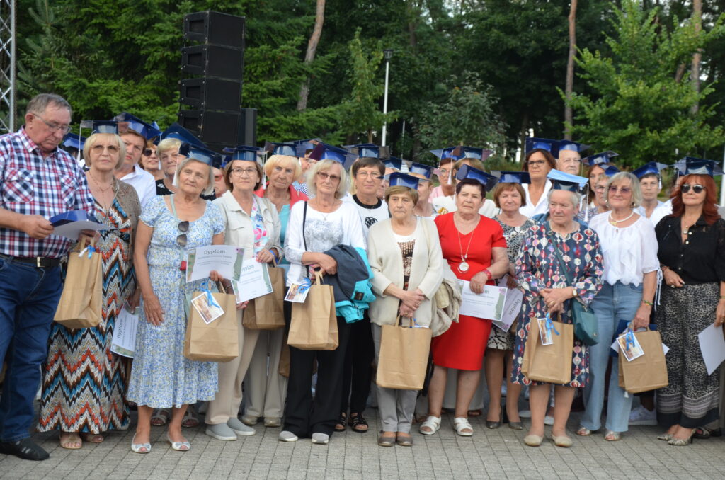 Entuzjaści Świata zakończyli naukę w Uniwersytecie Entuzjastów Świata! Wczoraj (13.07) w ksiąskim Amfiteatrze odbyło się uroczyste podsumowanie roku akademickiego 2024/2025. Prezes stowarzyszenia Anna Kaczmarek przejrzała indeksy i „zaliczyła” studentom kolejny etap edukacji 😉. Bohaterowie tego wydarzenia (których było ponad 100!), poprowadzonego przez Mariolę Kaźmierczak, dyrektora Centrum Kultury, otrzymali również gratulacje od „wicerektor” Mireli Grześkowiak, zastępcy burmistrza Książa Wlkp. oraz od Anny Ślipko-Rewers, kierownika Ośrodka Pomocy Społecznej w Książu Wlkp. Ta ostatnia wspomniała również o różnych możliwościach wsparcia dla seniorów ze strony zarządzanej przez nią instytucji. Tradycyjnie już Entuzjaści Świata otrzymali dyplomy, drobne upominki i birety, które poszybowały w góry w rytm muzyki przygrywanej przez Amigo Band.