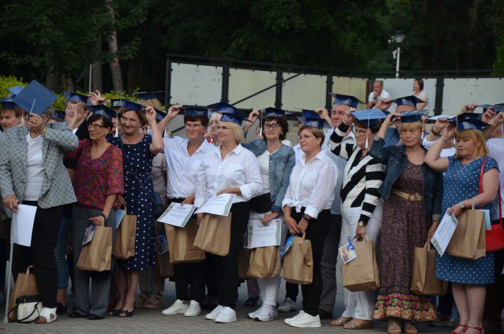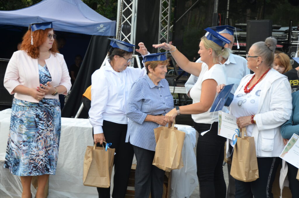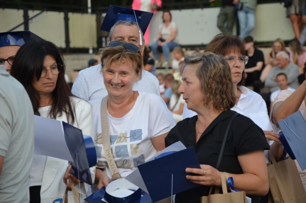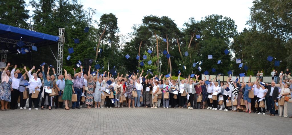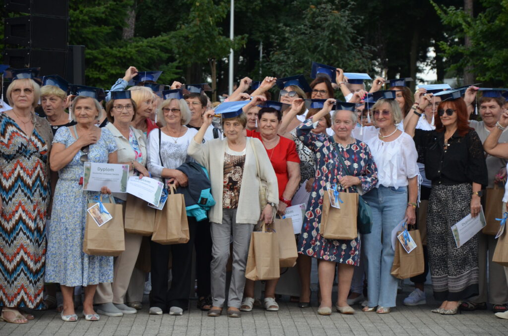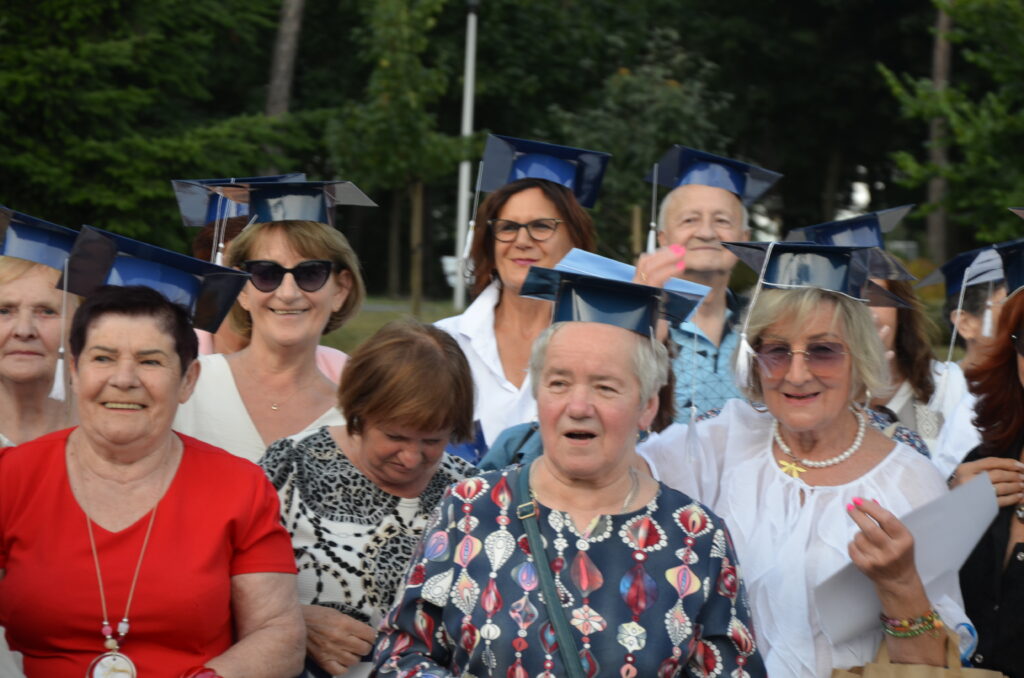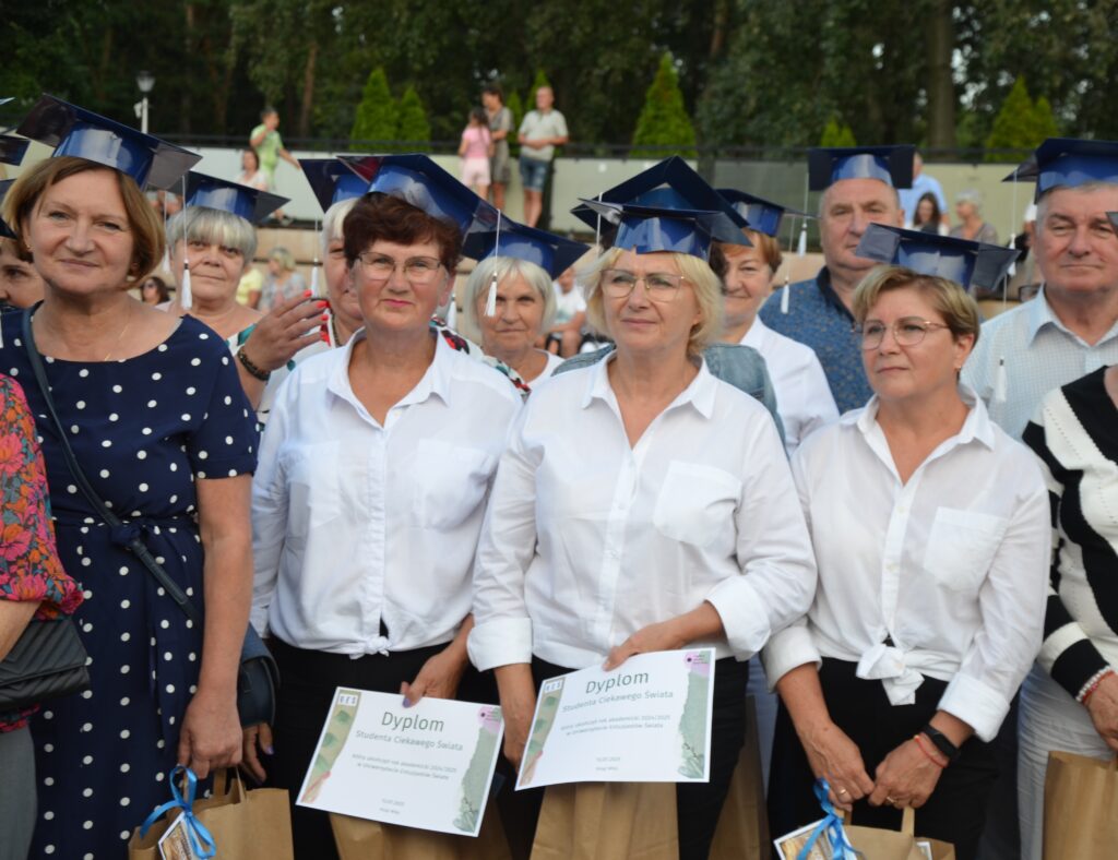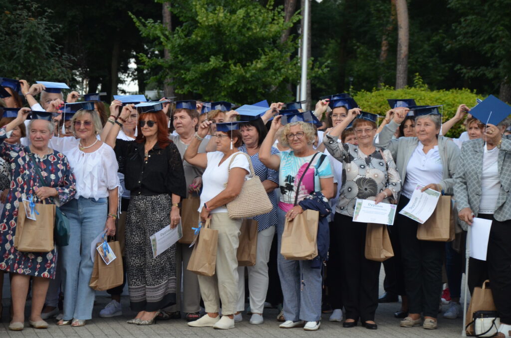 Entuzjaści Świata zakończyli naukę w Uniwersytecie Entuzjastów Świata! Wczoraj (13.07) w ksiąskim Amfiteatrze odbyło się uroczyste podsumowanie roku akademickiego 2024/2025. Prezes stowarzyszenia Anna Kaczmarek przejrzała indeksy i „zaliczyła” studentom kolejny etap edukacji 😉. Bohaterowie tego wydarzenia (których było ponad 100!), poprowadzonego przez Mariolę Kaźmierczak, dyrektora Centrum Kultury, otrzymali również gratulacje od „wicerektor” Mireli Grześkowiak, zastępcy burmistrza Książa Wlkp. oraz od Anny Ślipko-Rewers, kierownika Ośrodka Pomocy Społecznej w Książu Wlkp. Ta ostatnia wspomniała również o różnych możliwościach wsparcia dla seniorów ze strony zarządzanej przez nią instytucji. Tradycyjnie już Entuzjaści Świata otrzymali dyplomy, drobne upominki i birety, które poszybowały w góry w rytm muzyki przygrywanej przez Amigo Band.