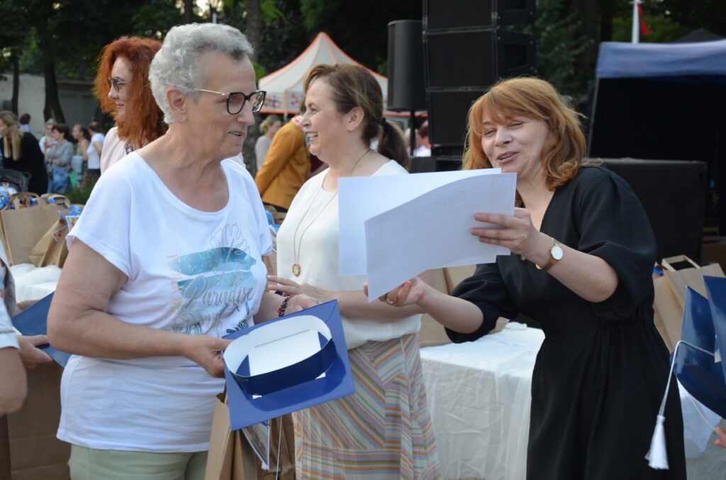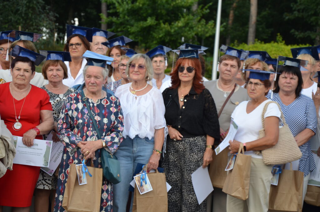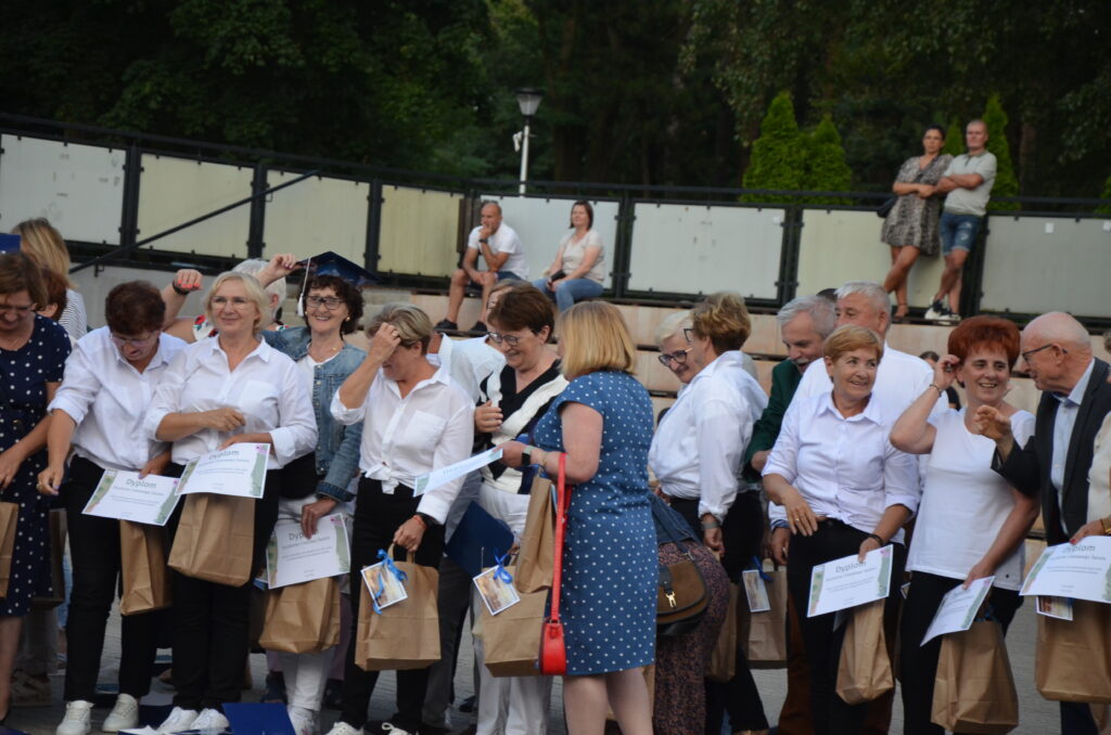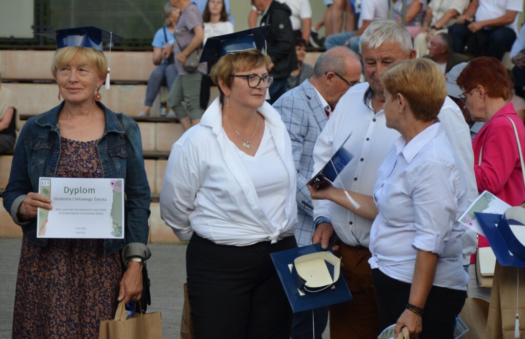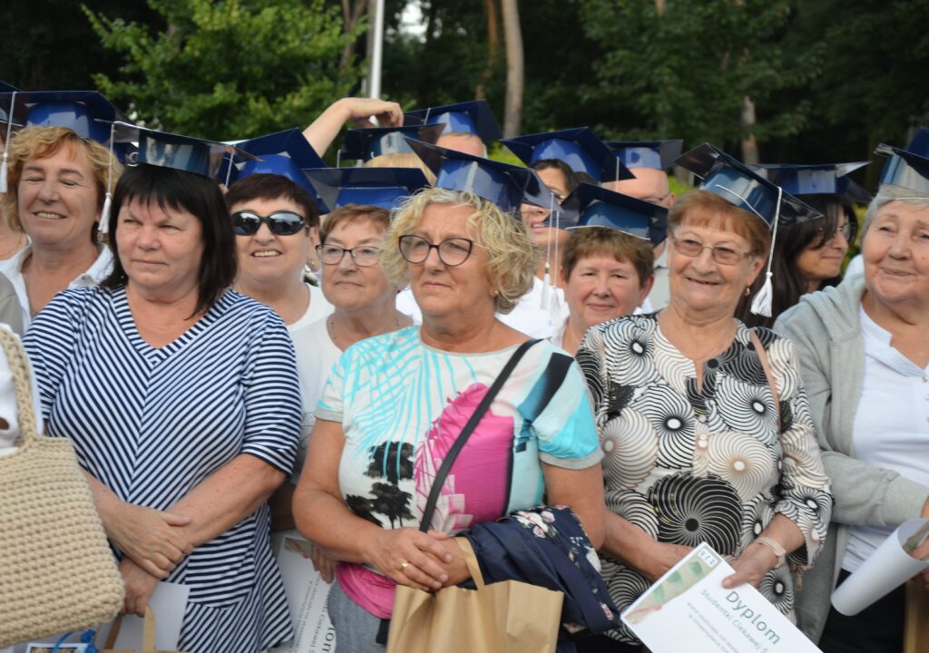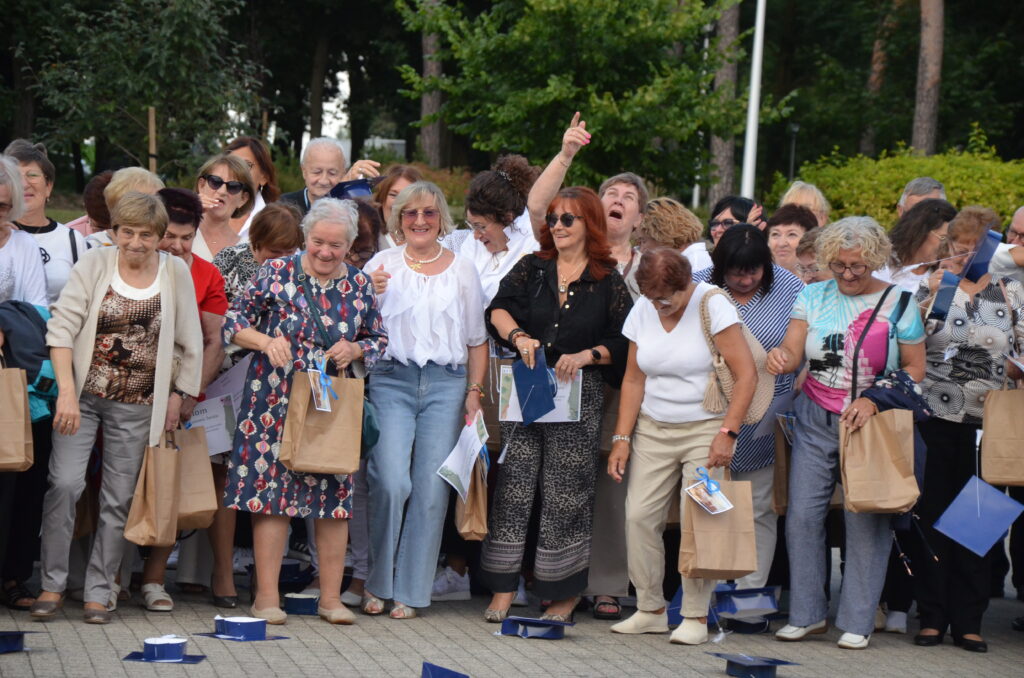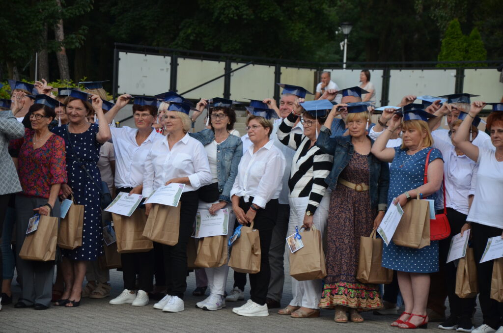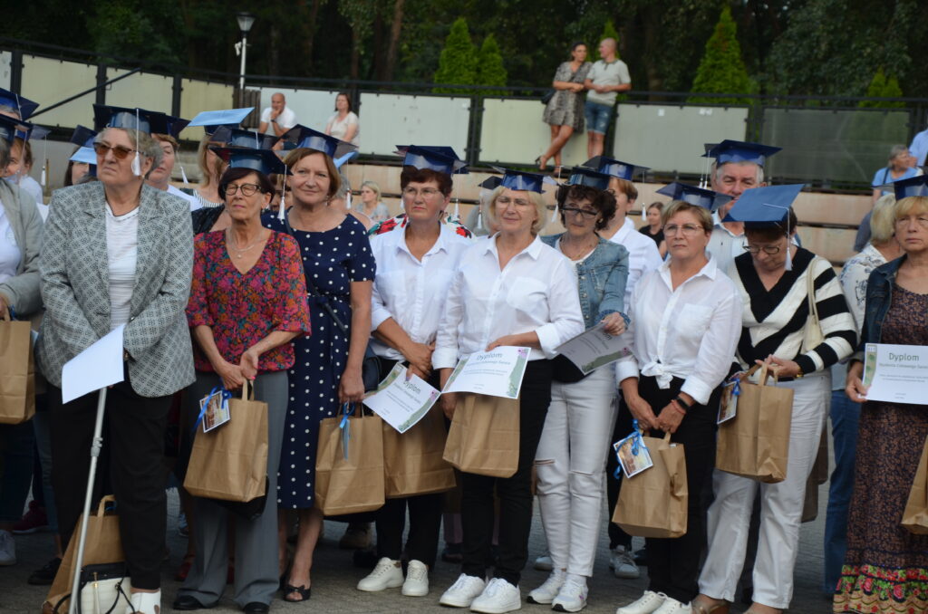 Entuzjaści Świata zakończyli naukę w Uniwersytecie Entuzjastów Świata! Wczoraj (13.07) w ksiąskim Amfiteatrze odbyło się uroczyste podsumowanie roku akademickiego 2024/2025. Prezes stowarzyszenia Anna Kaczmarek przejrzała indeksy i „zaliczyła” studentom kolejny etap edukacji 😉. Bohaterowie tego wydarzenia (których było ponad 100!), poprowadzonego przez Mariolę Kaźmierczak, dyrektora Centrum Kultury, otrzymali również gratulacje od „wicerektor” Mireli Grześkowiak, zastępcy burmistrza Książa Wlkp. oraz od Anny Ślipko-Rewers, kierownika Ośrodka Pomocy Społecznej w Książu Wlkp. Ta ostatnia wspomniała również o różnych możliwościach wsparcia dla seniorów ze strony zarządzanej przez nią instytucji. Tradycyjnie już Entuzjaści Świata otrzymali dyplomy, drobne upominki i birety, które poszybowały w góry w rytm muzyki przygrywanej przez Amigo Band.