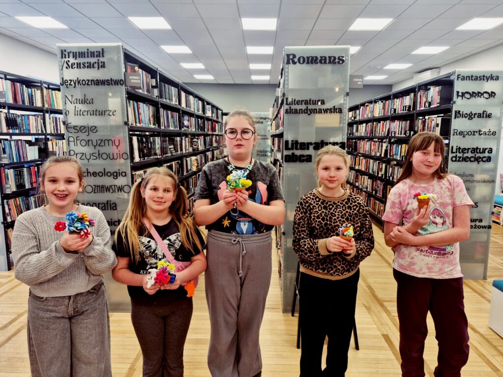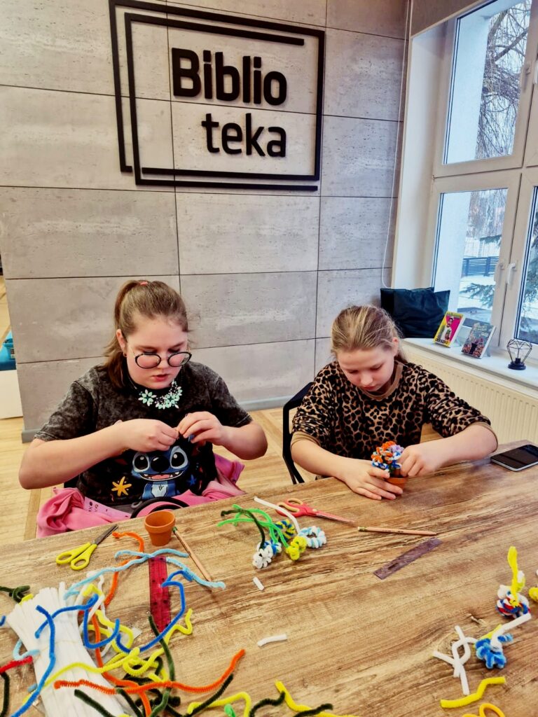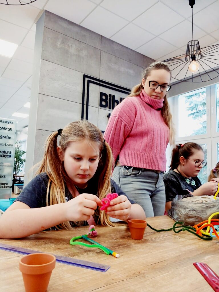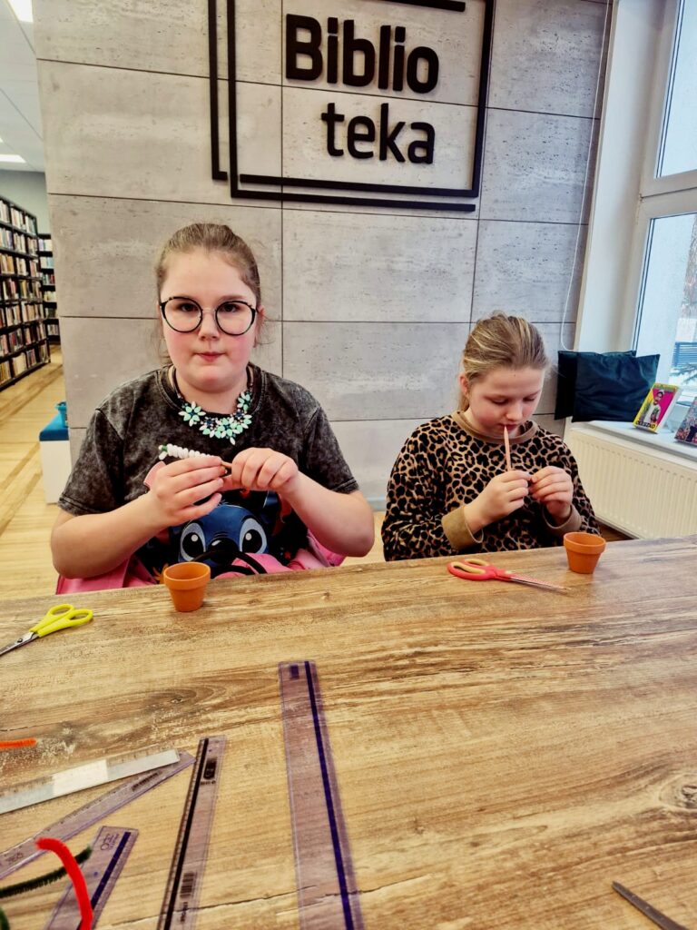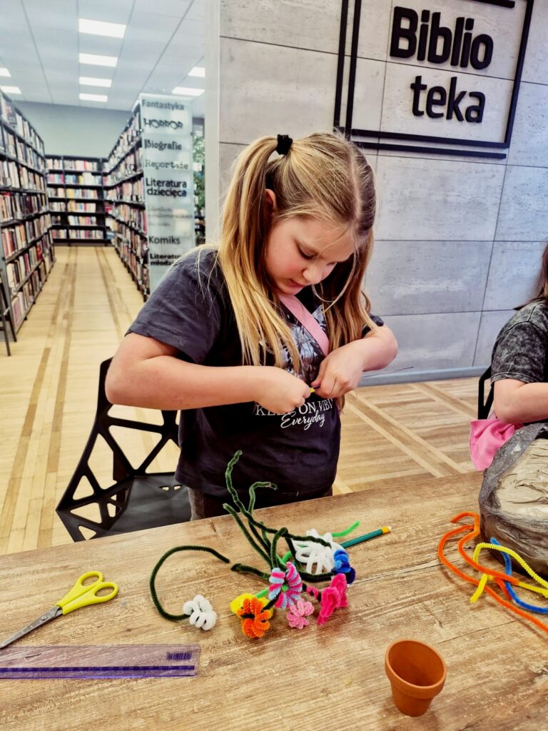 Dzisiaj w bibliotece dzieci wykazały się ogromną kreatywnością, tworząc kolorowe kwiaty doniczkowe z drucików kreatywnych.
