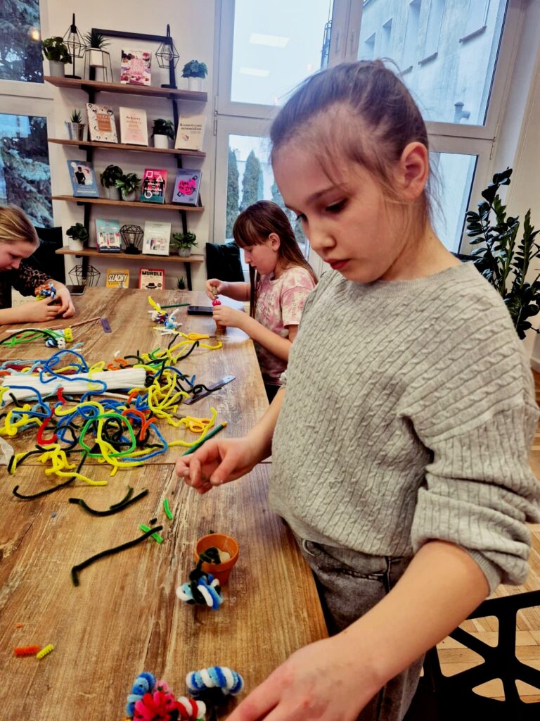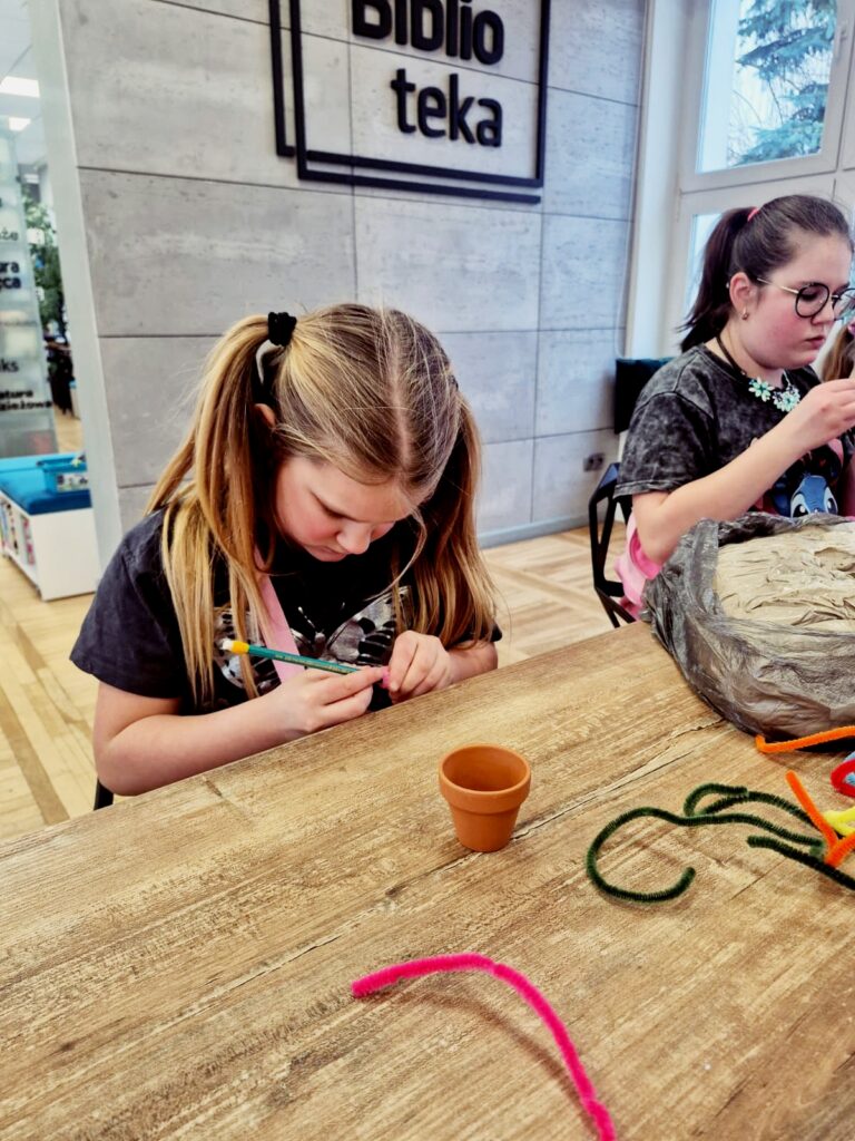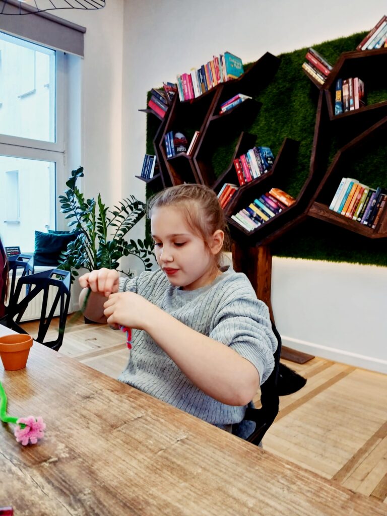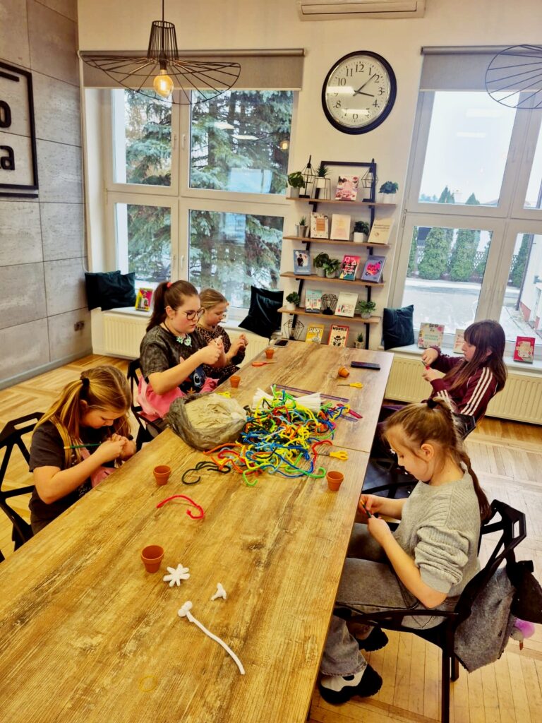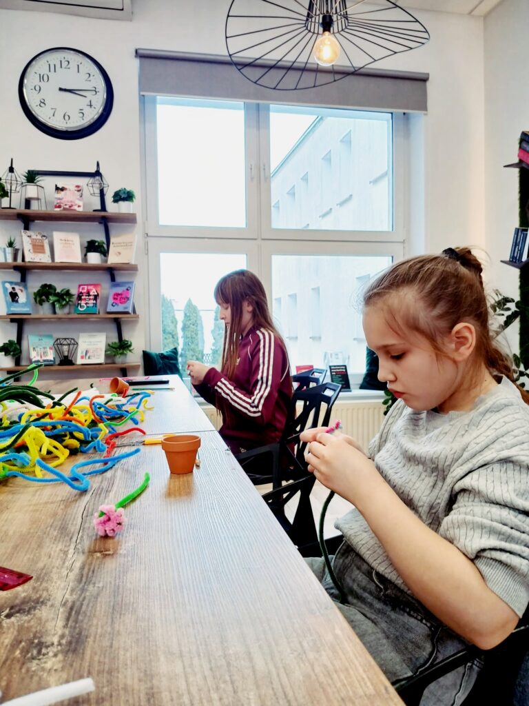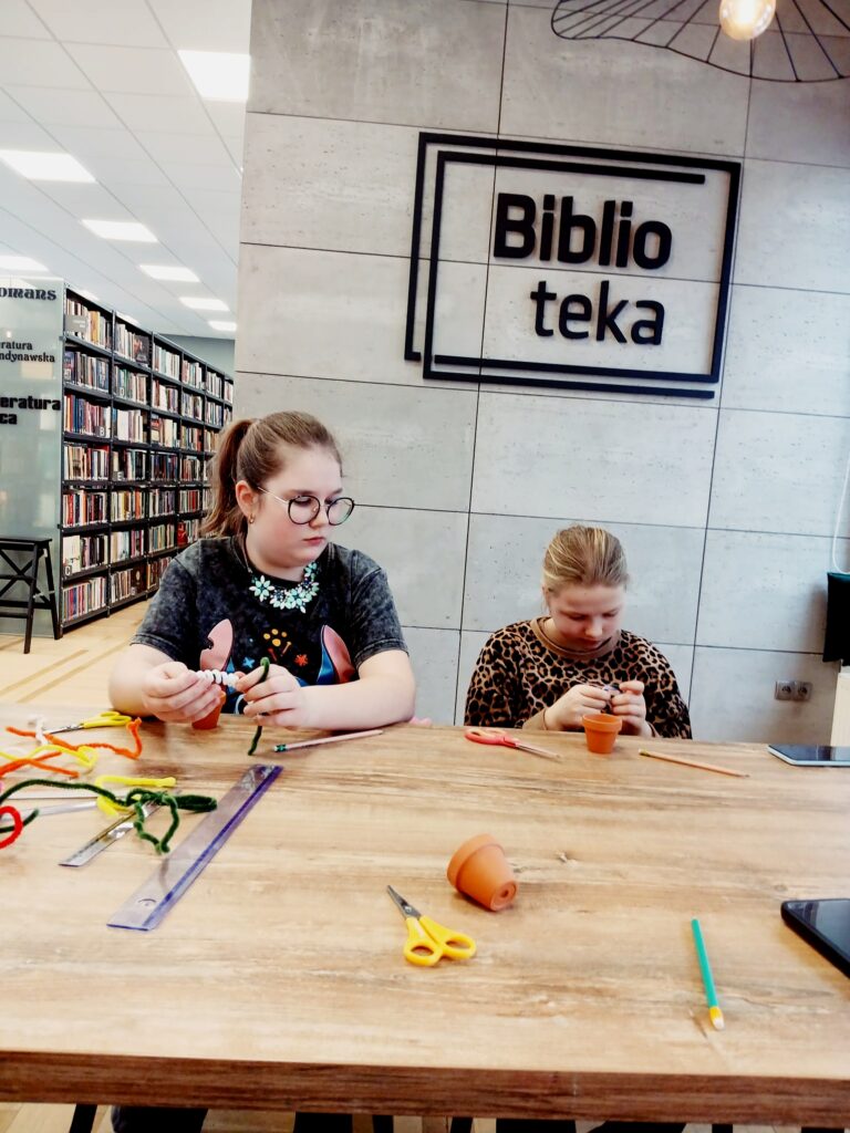 Dzisiaj w bibliotece dzieci wykazały się ogromną kreatywnością, tworząc kolorowe kwiaty doniczkowe z drucików kreatywnych.