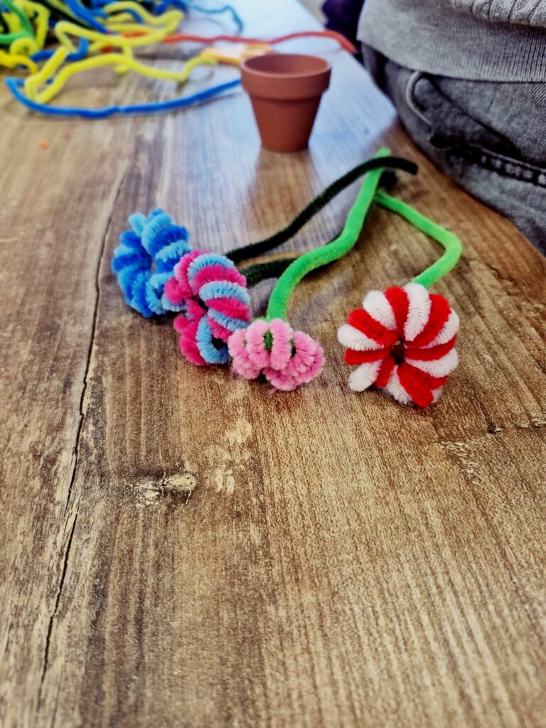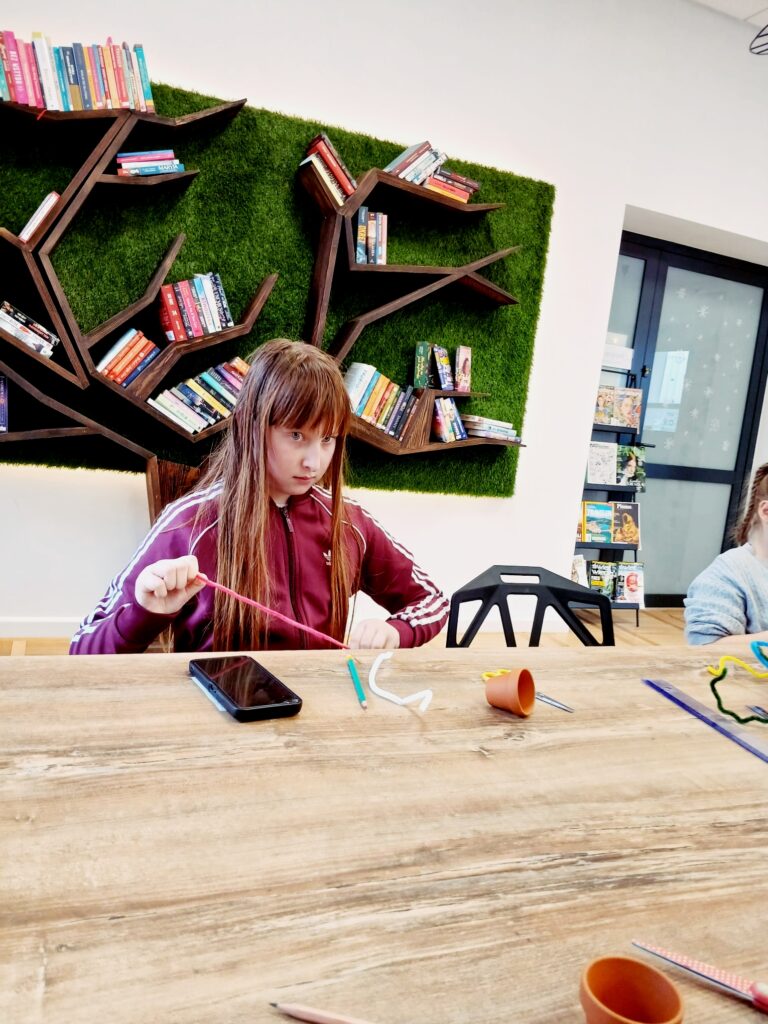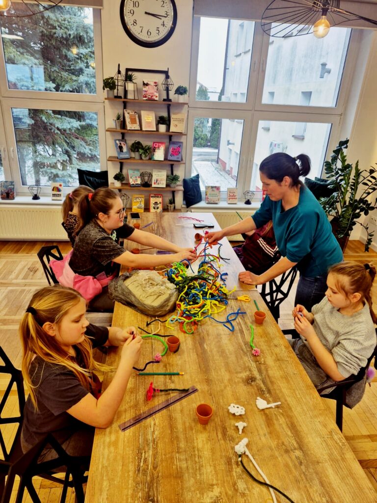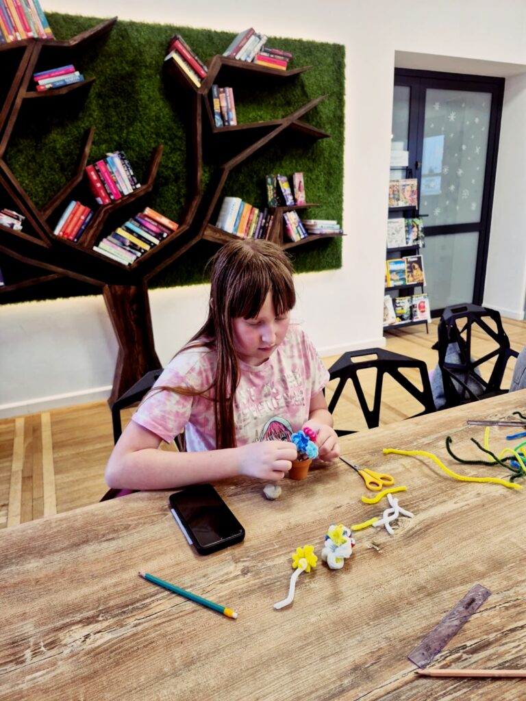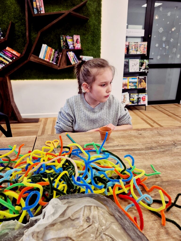 Dzisiaj w bibliotece dzieci wykazały się ogromną kreatywnością, tworząc kolorowe kwiaty doniczkowe z drucików kreatywnych.