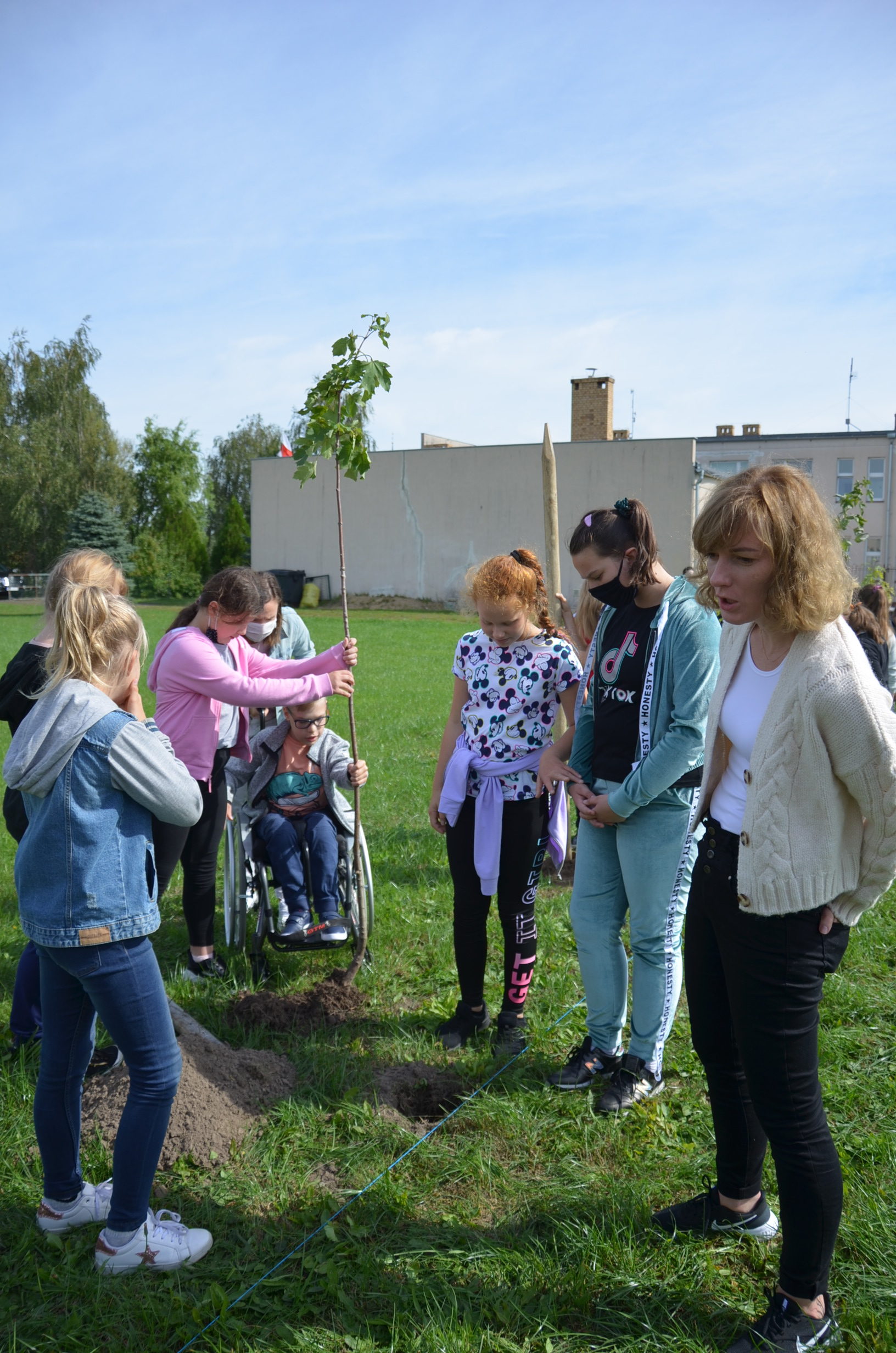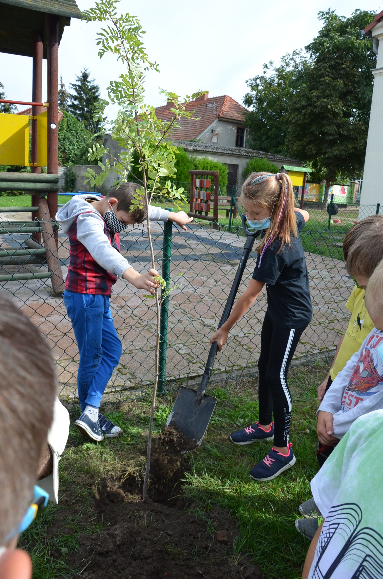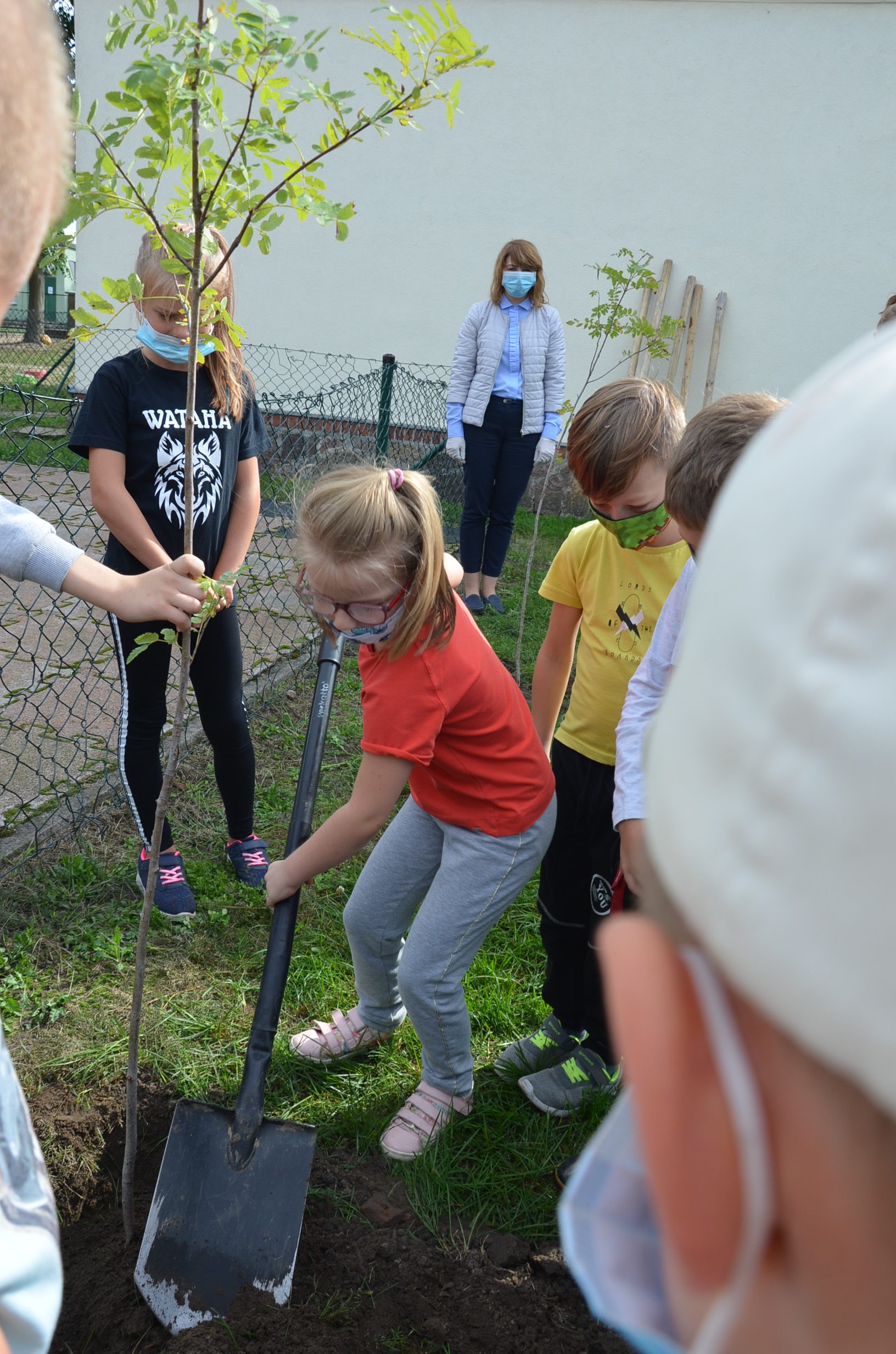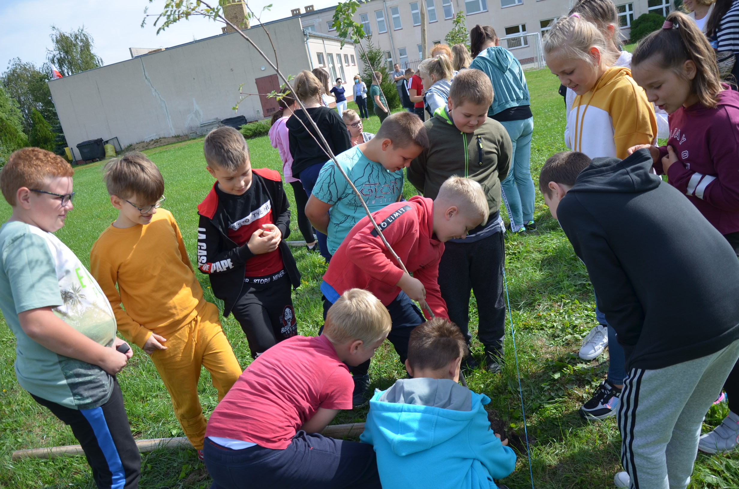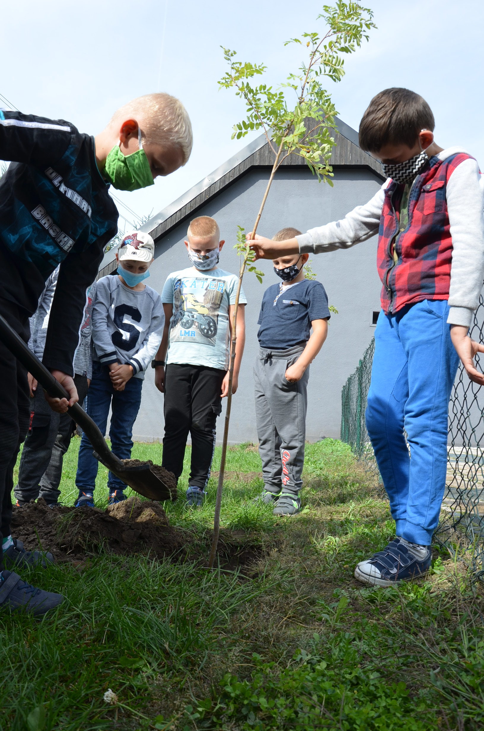 - Zdjęcie przedstawia dzieci i prace nasadzeniowe drzew