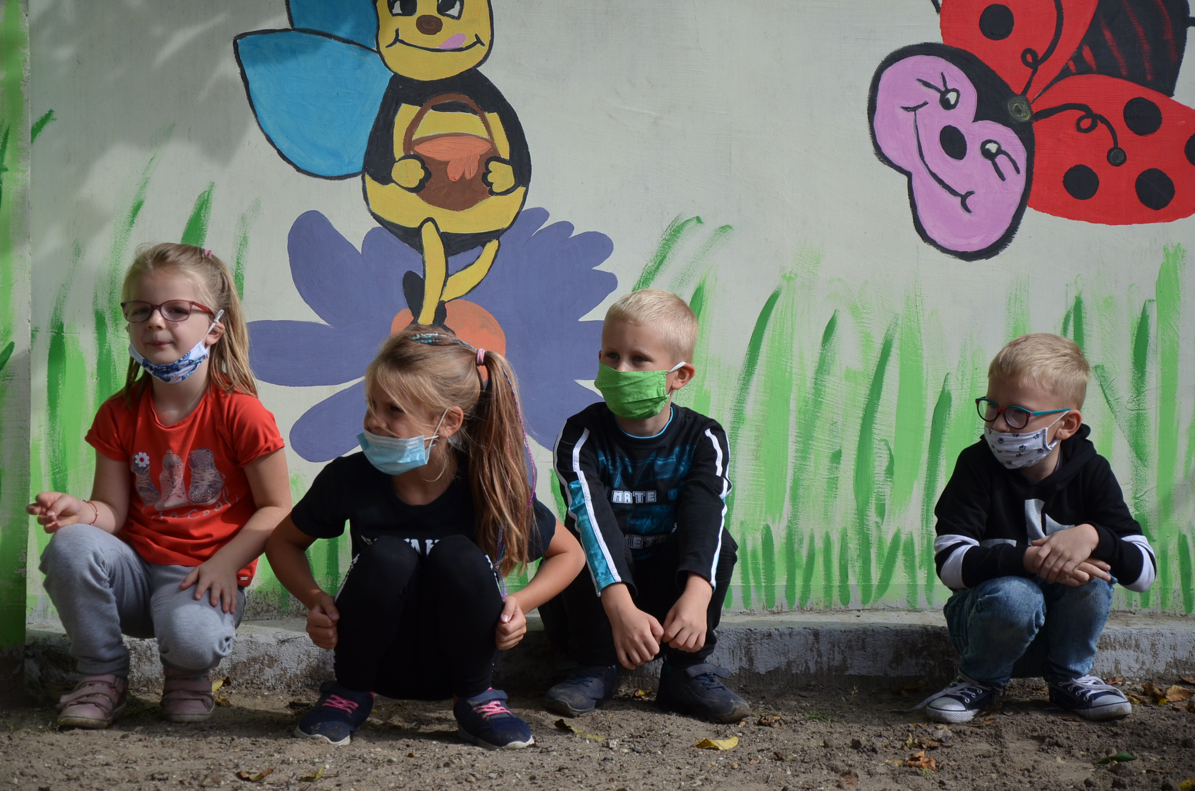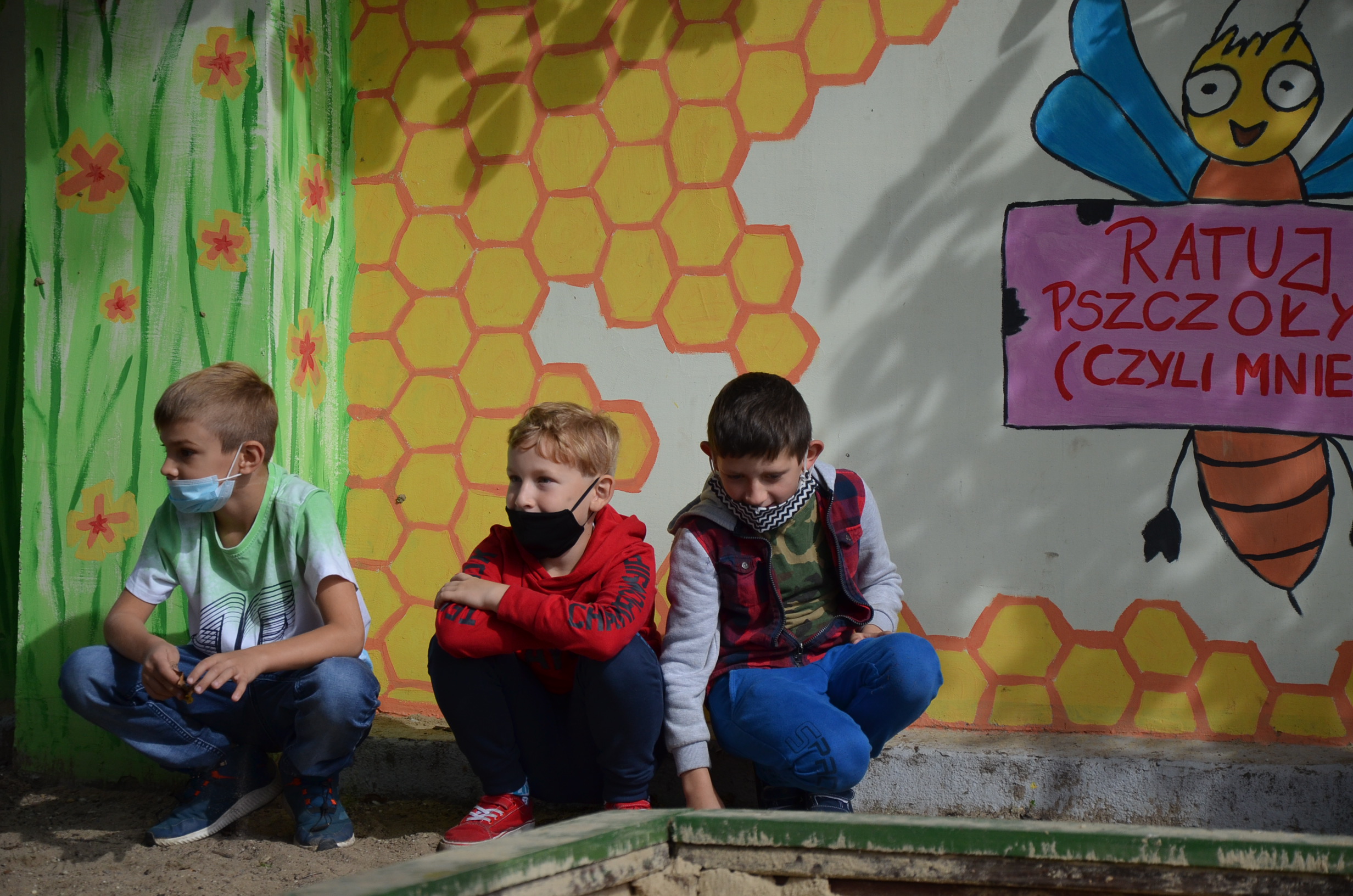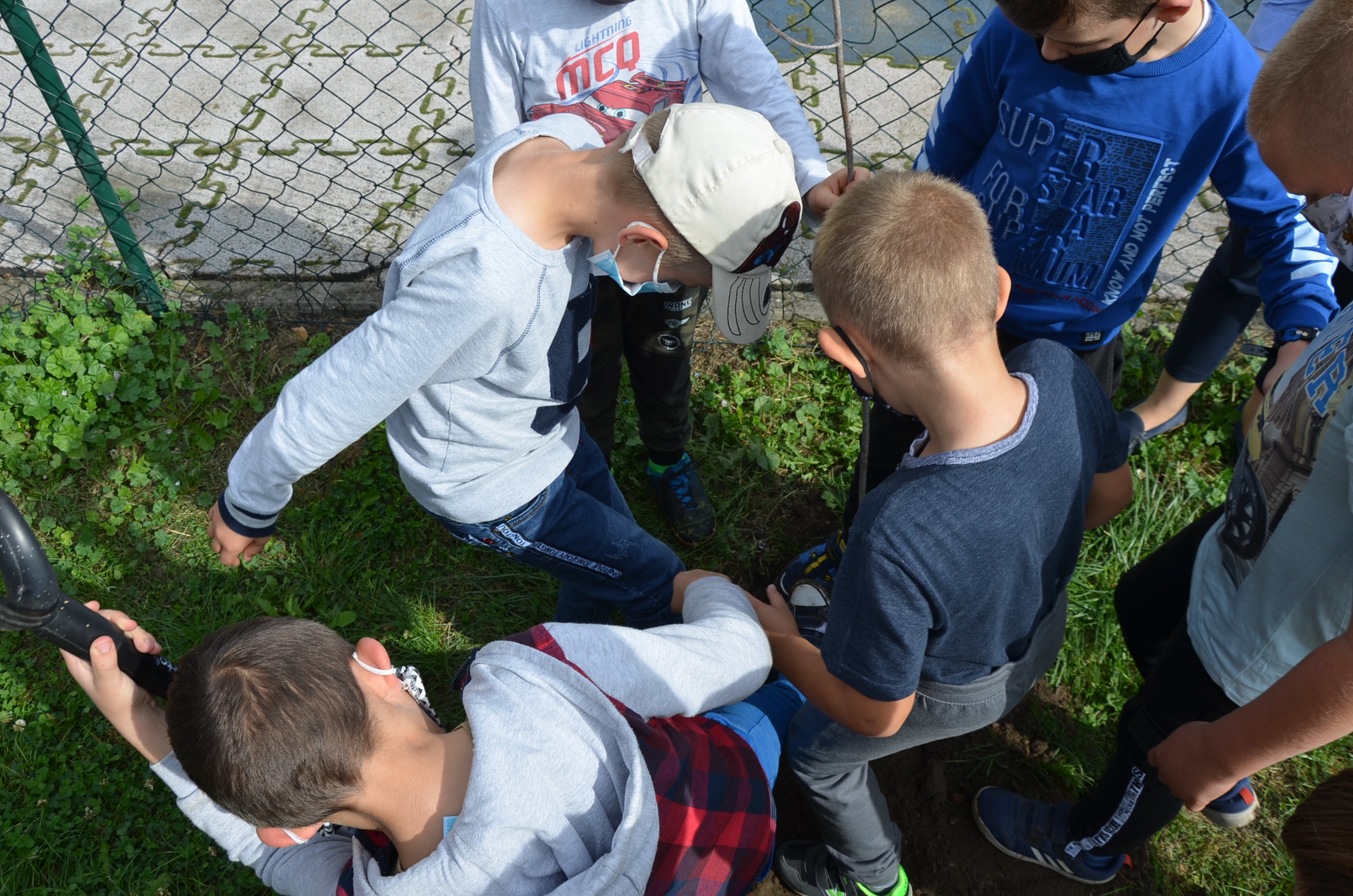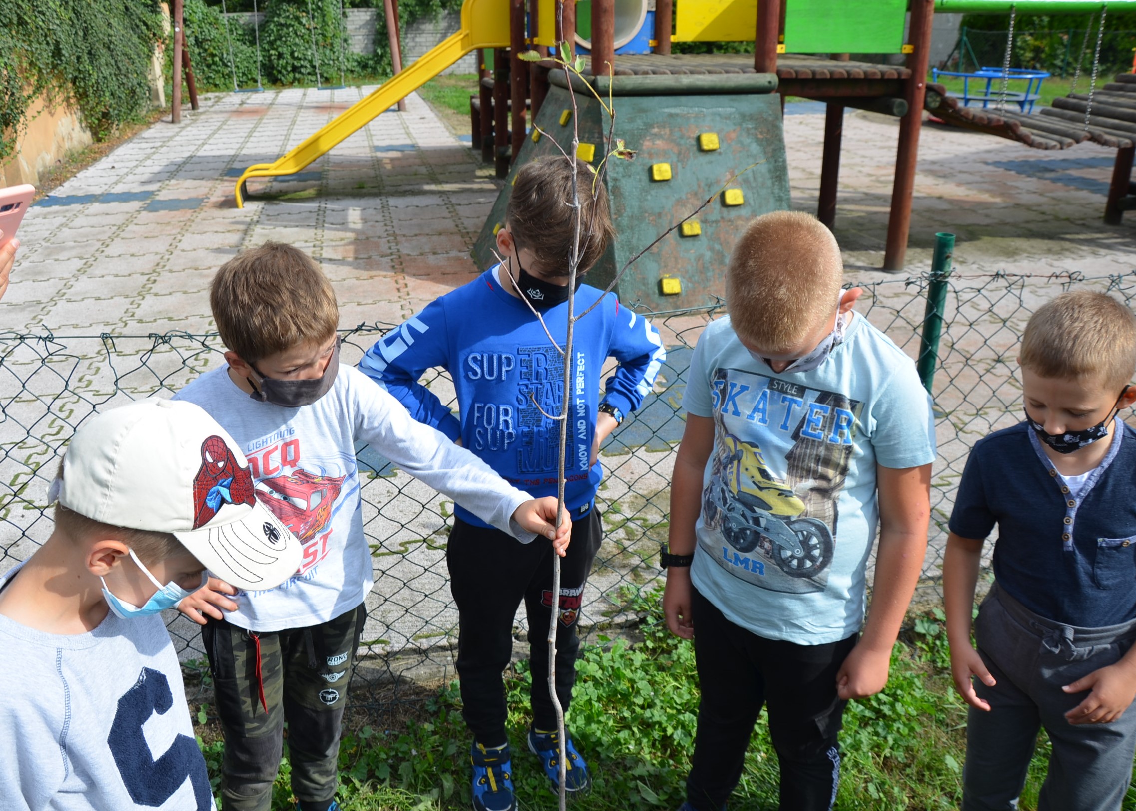 - Zdjęcie przedstawia dzieci i prace nasadzeniowe drzew