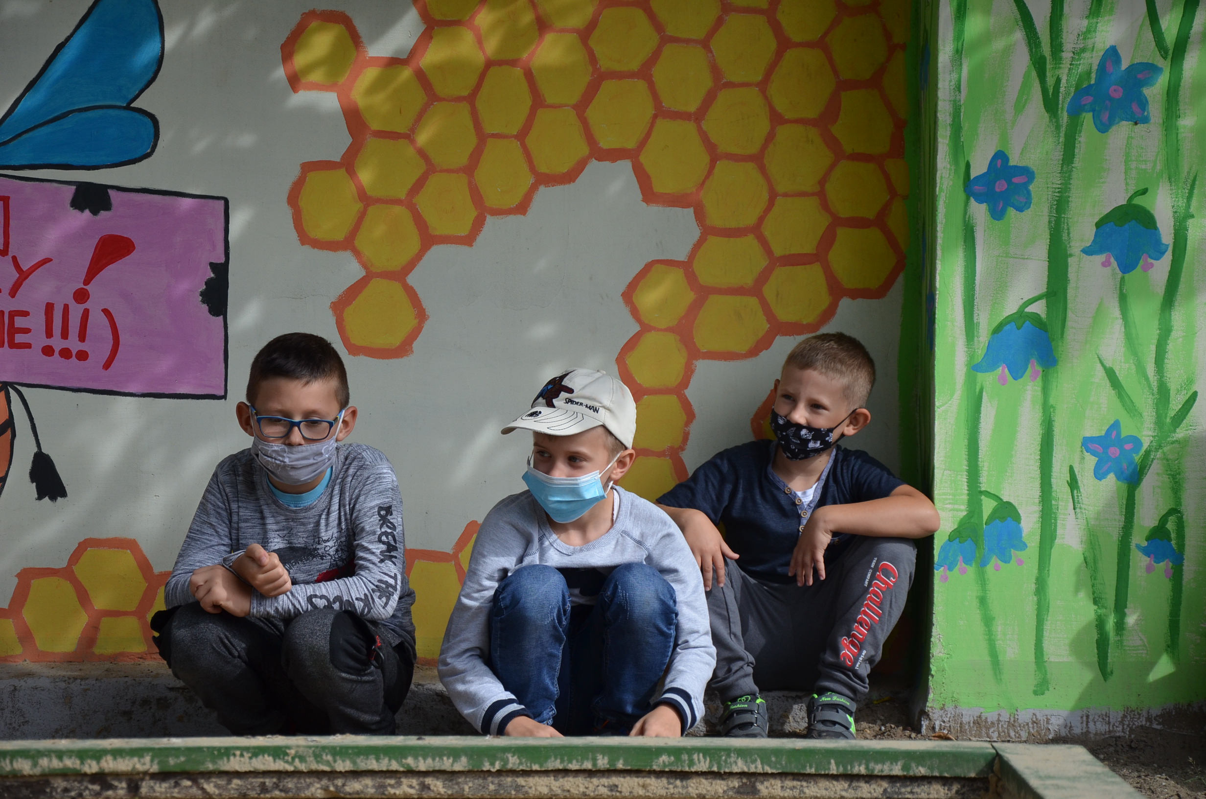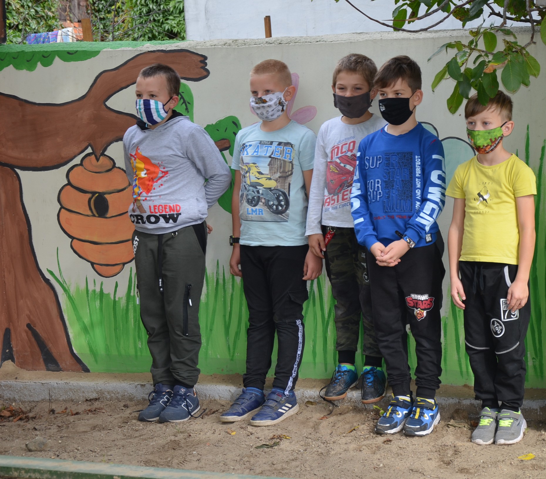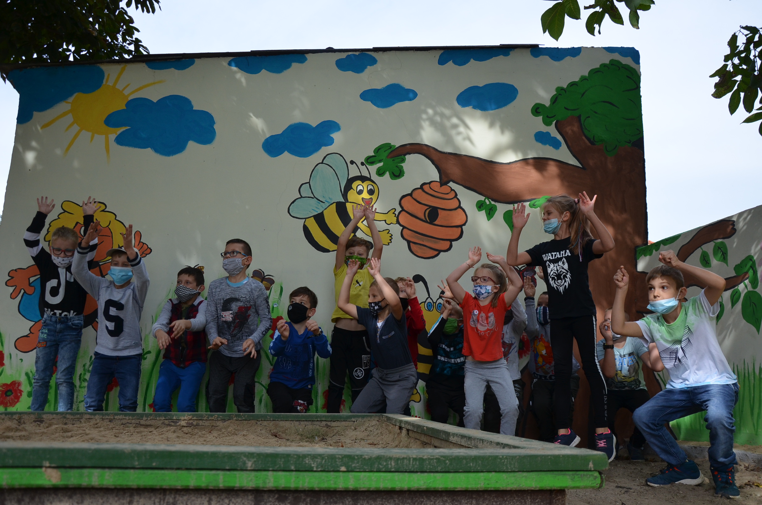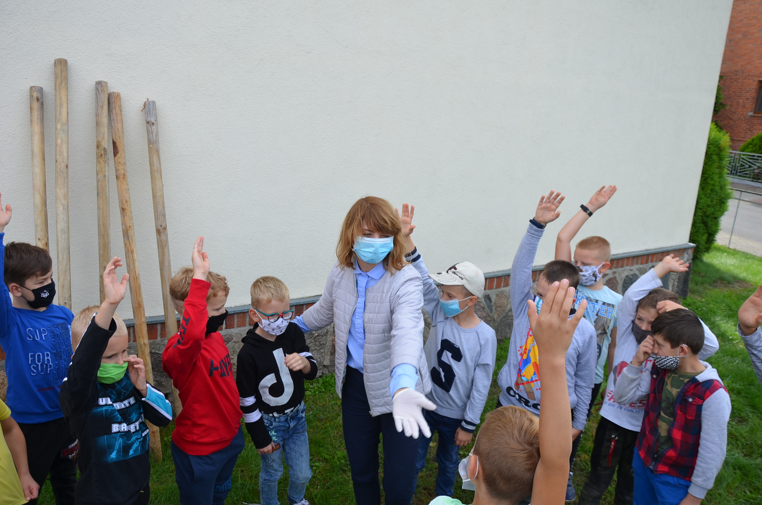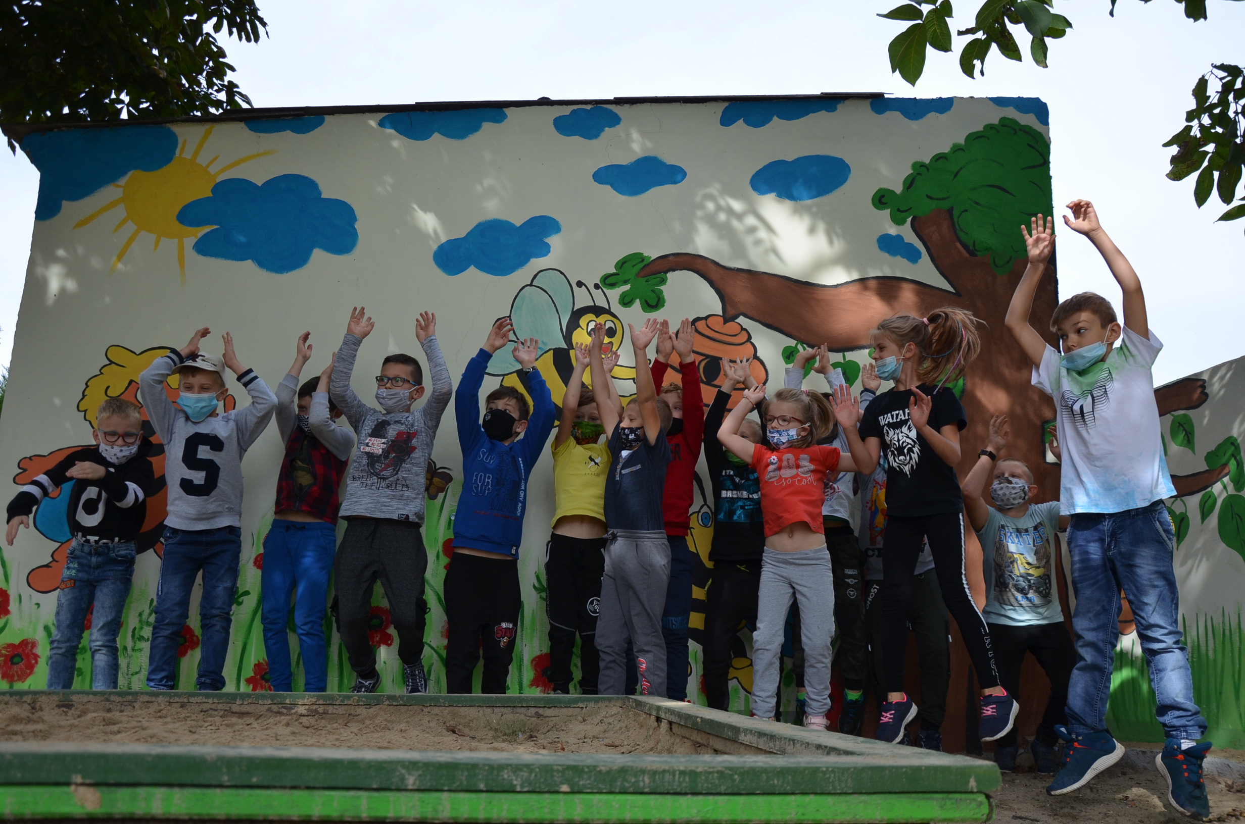 - Zdjęcie przedstawia dzieci i prace nasadzeniowe drzew