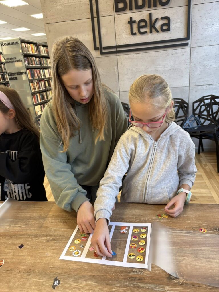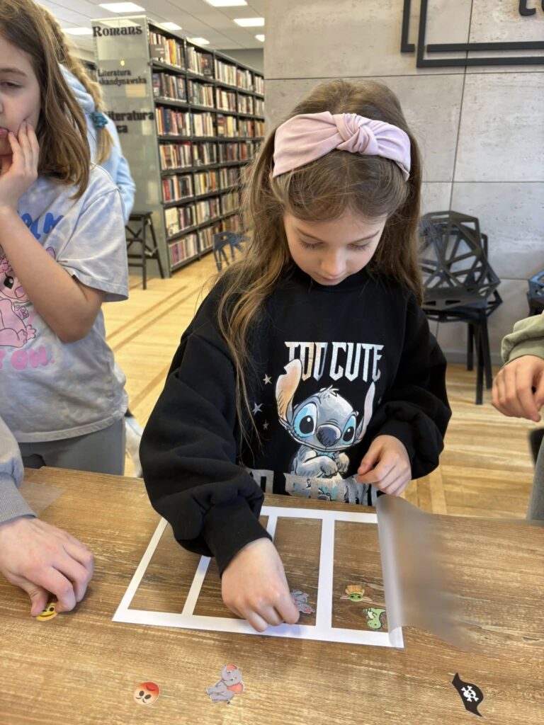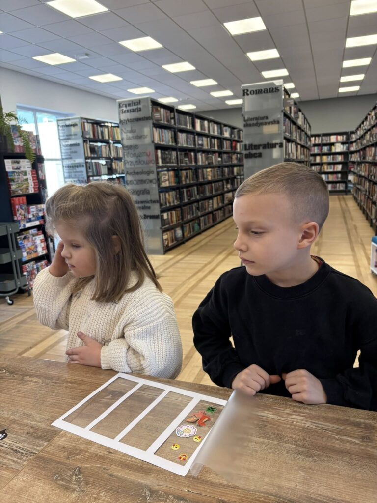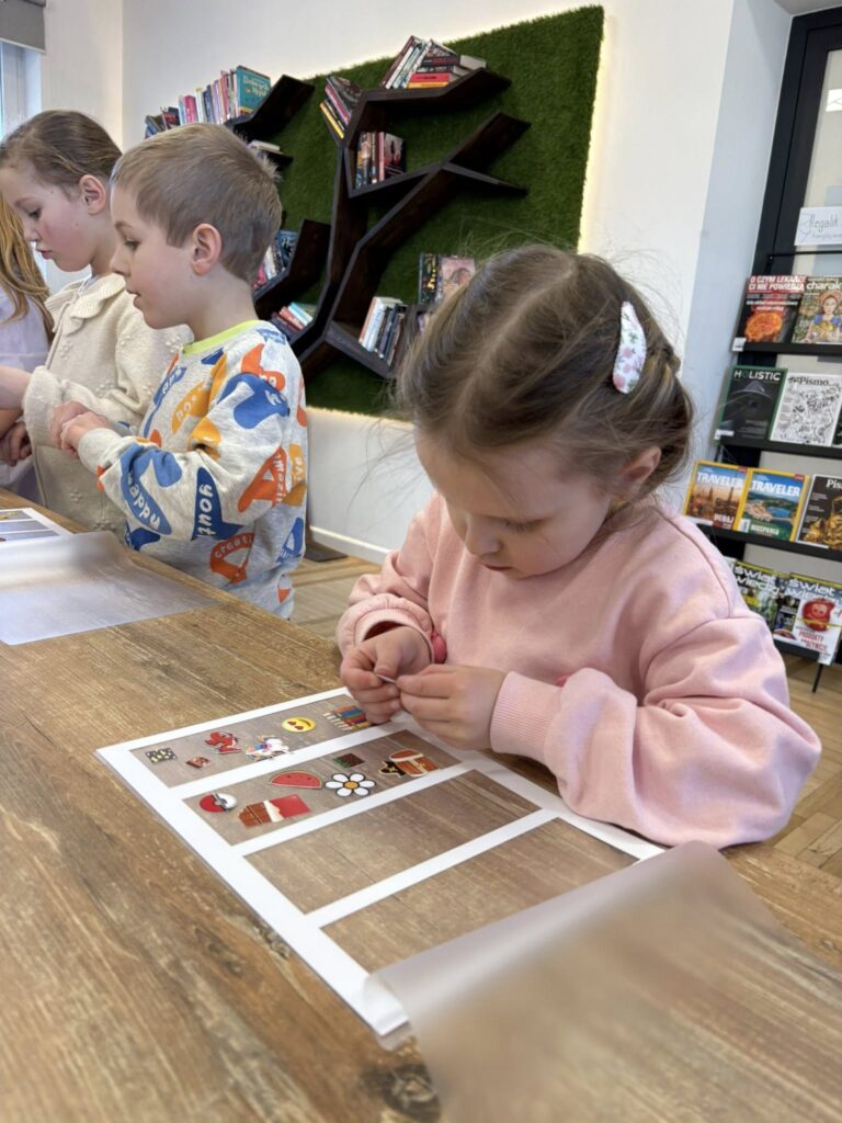Po śniadaniu podzieliliśmy się na dwie grupy – jedna wybrała się do biblioteki aby zrobić swoje personalizowane zakładki , a druga na spacer i zabawy na placu zabaw. Po pewnym czasie nastąpiła zamiana.