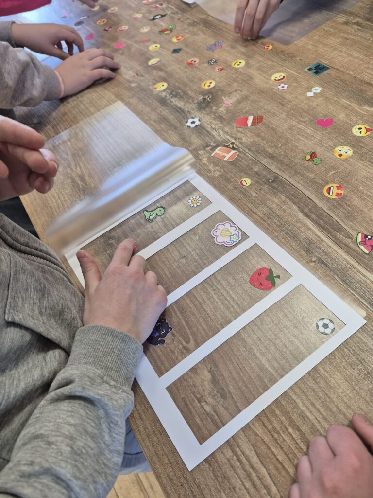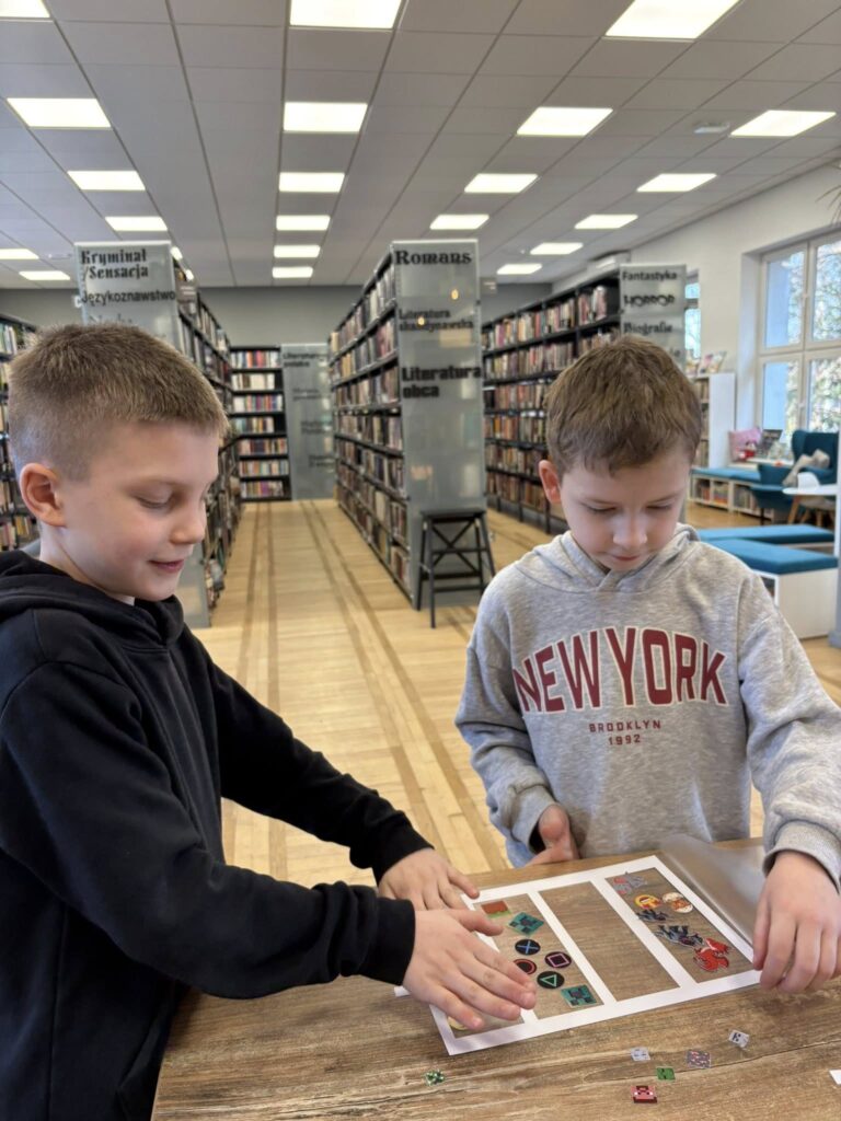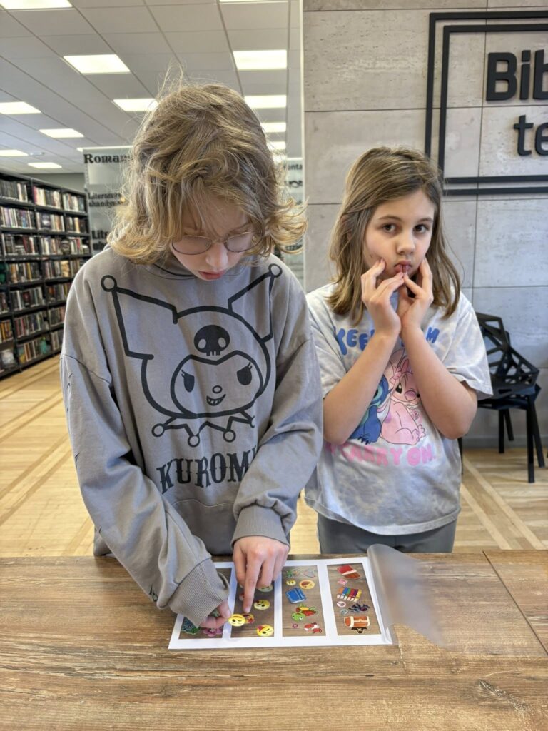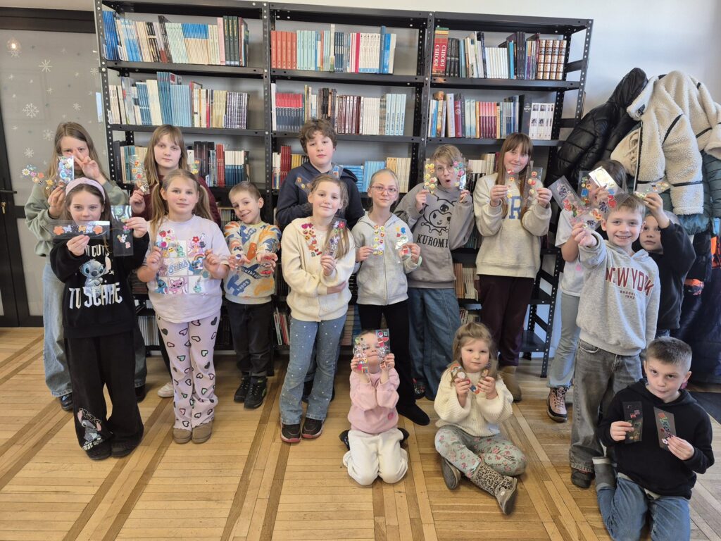 Po śniadaniu podzieliliśmy się na dwie grupy – jedna wybrała się do biblioteki aby zrobić swoje personalizowane zakładki , a druga na spacer i zabawy na placu zabaw. Po pewnym czasie nastąpiła zamiana.