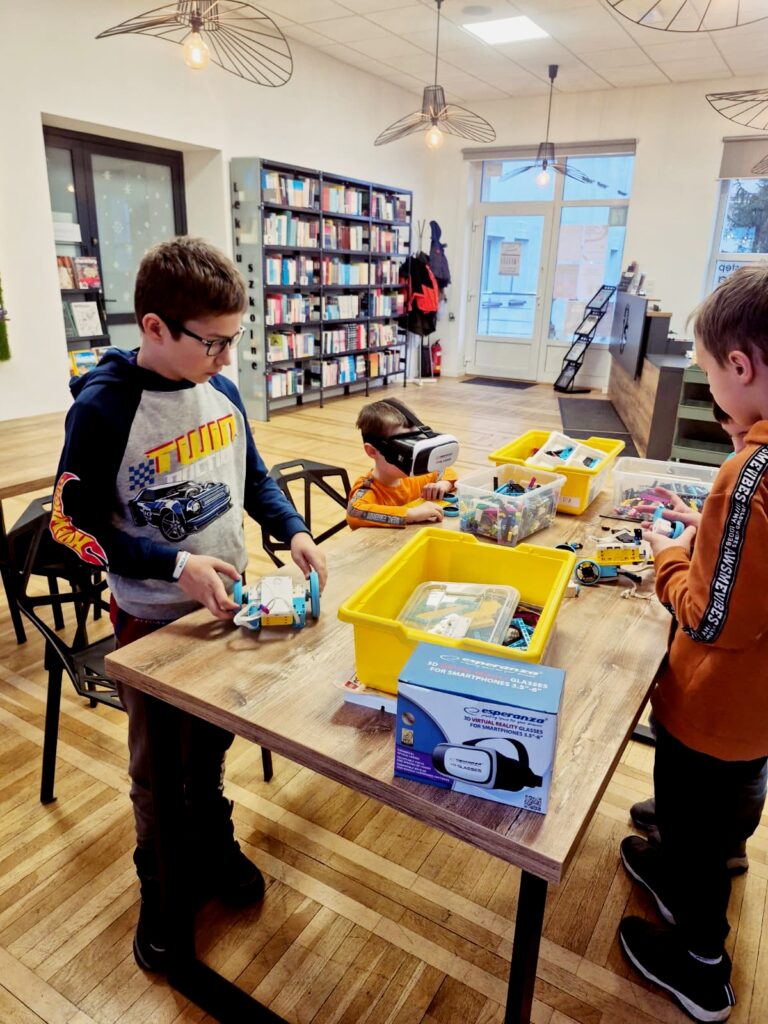 Uczestnicy zbudowali dwa niesamowite roboty-pojazdy, którymi urządzili prawdziwy rajdowy wyścig po bibliotece.