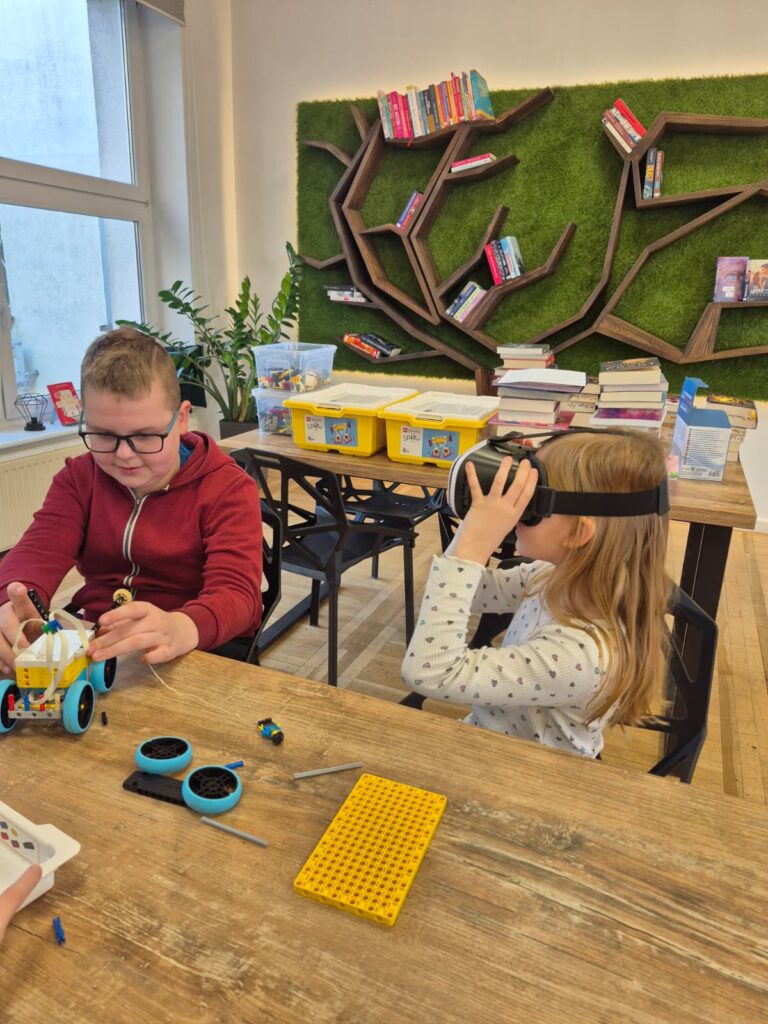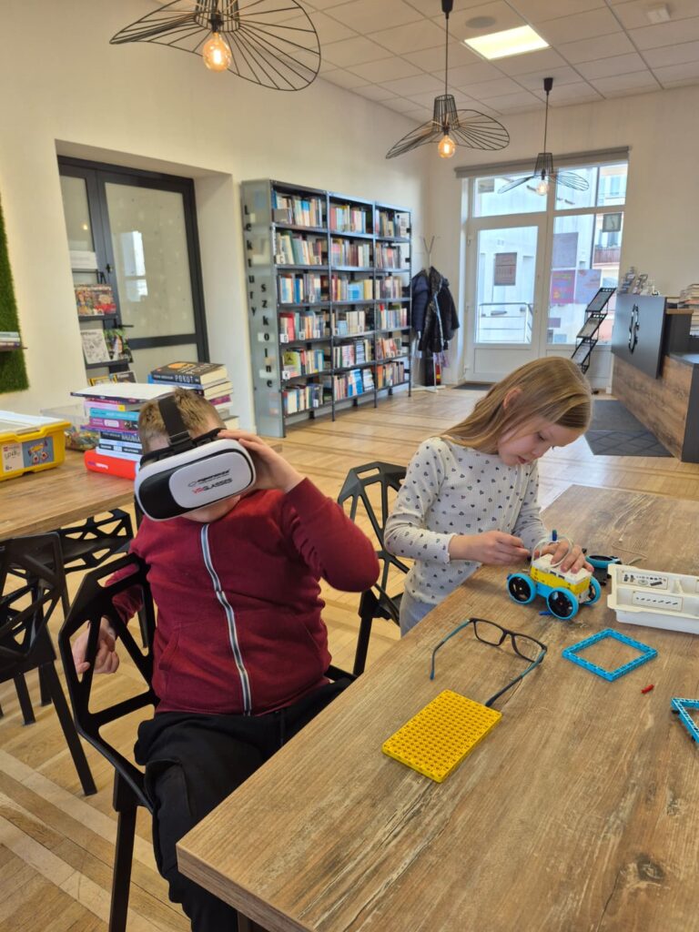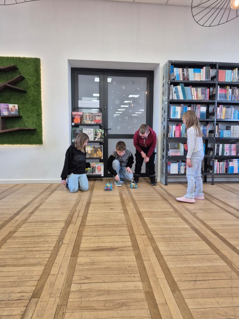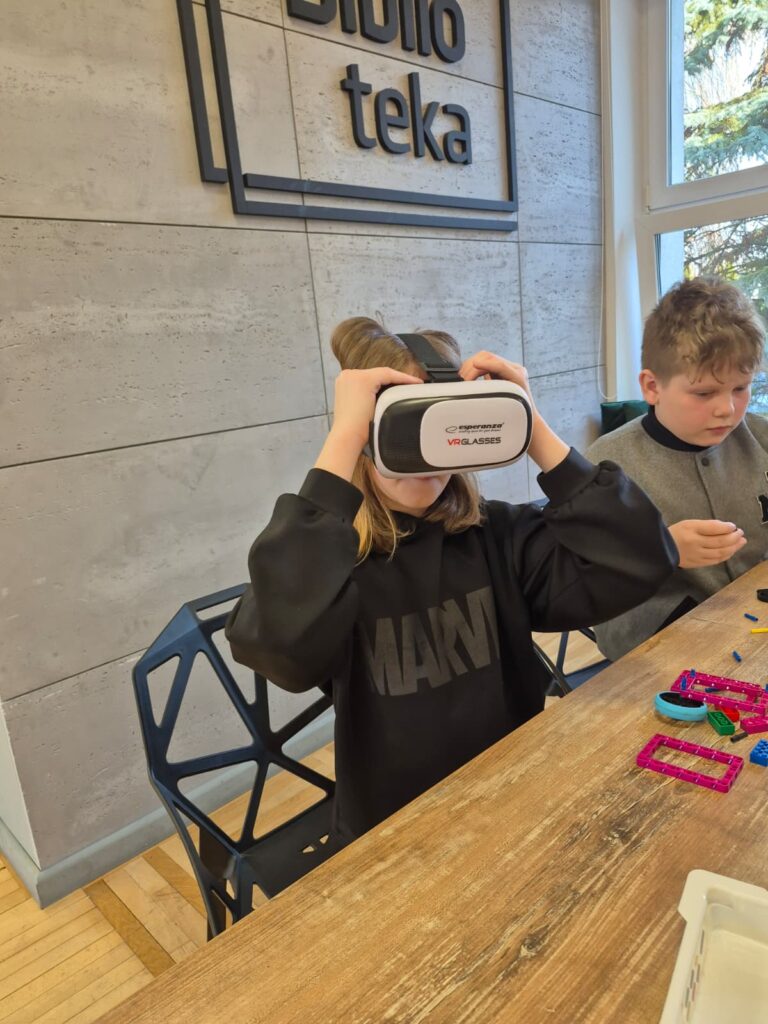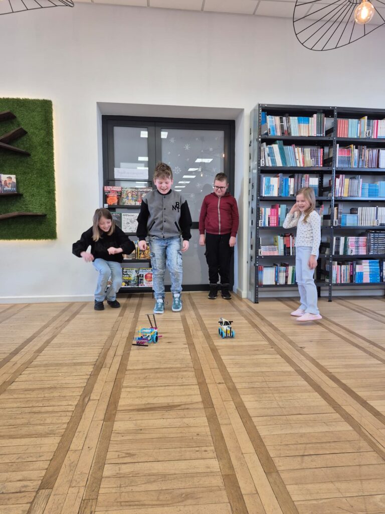 Na ostatniej feryjnej robotyce (25.02) bawiliśmy się okularami VR oraz urządziliśmy wyścigi robotów po bibliotece.
