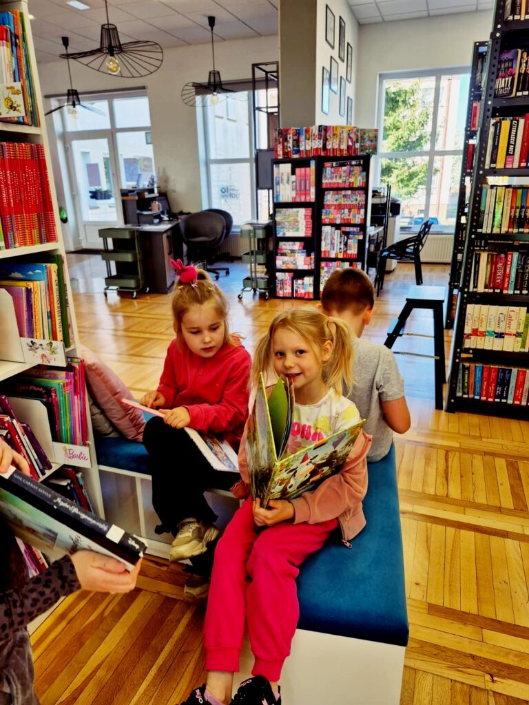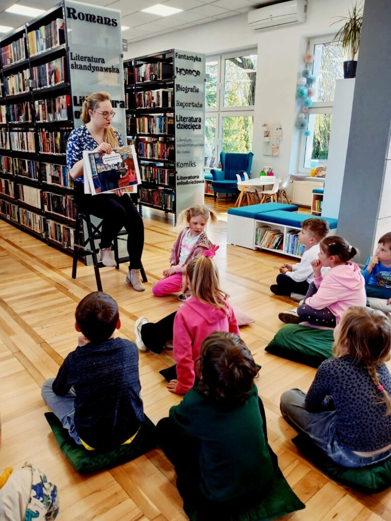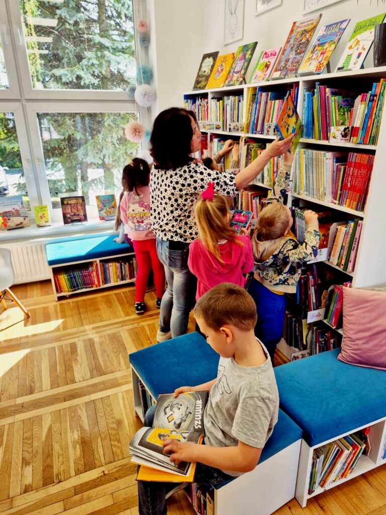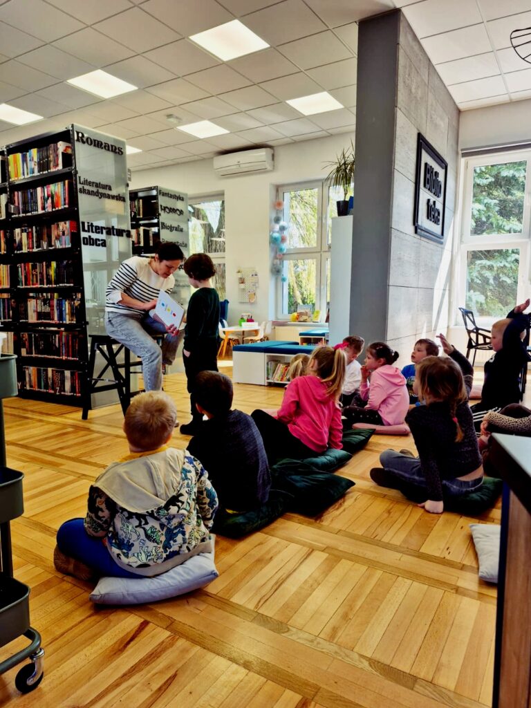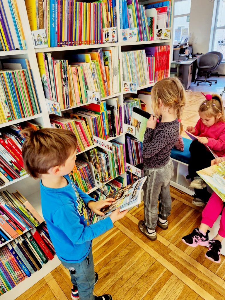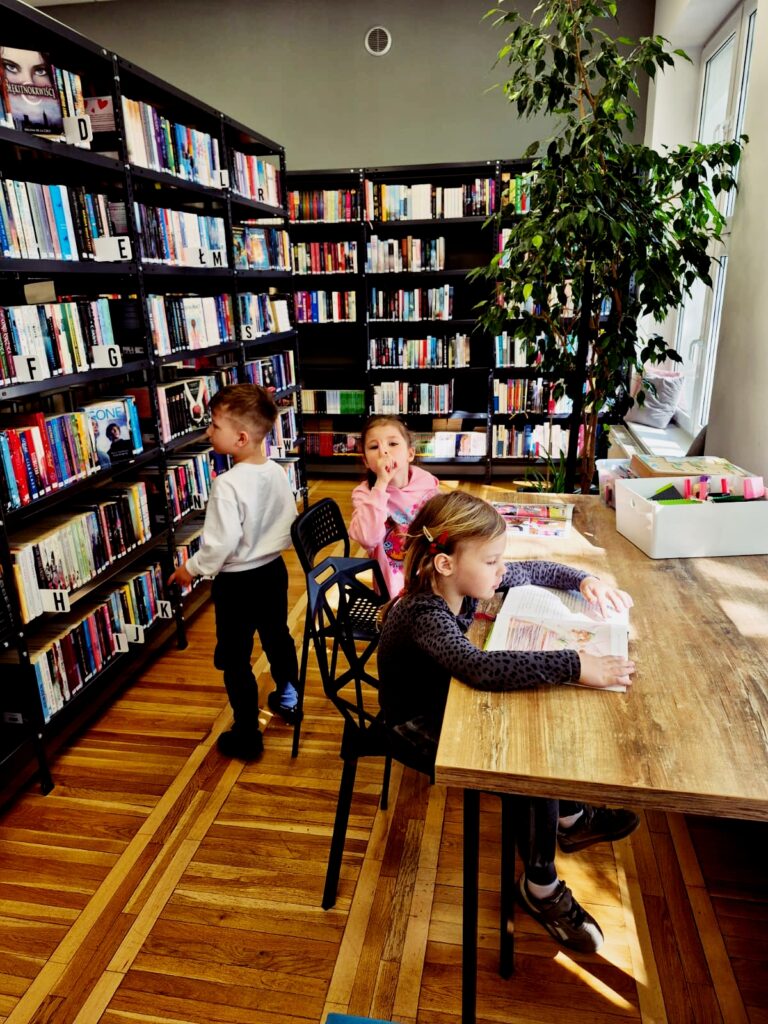 Wspólnie poznaliśmy zasady obowiązujące w bibliotece 📚🤫, przeczytaliśmy książkę 📘📖 oraz wykonaliśmy zadanie sprawdzające znajomość bajkowych postaci 🧚♀️🧞♂️. Na zakończenie dzieci miały też chwilę na swobodne zapoznanie się z księgozbiorem dla najmłodszych 📚👀✨.