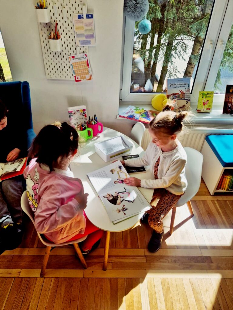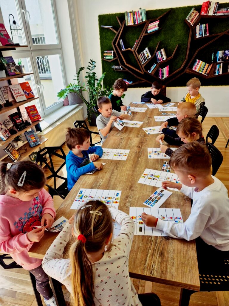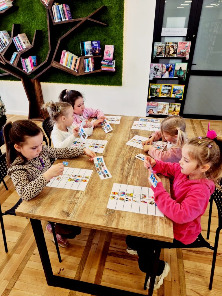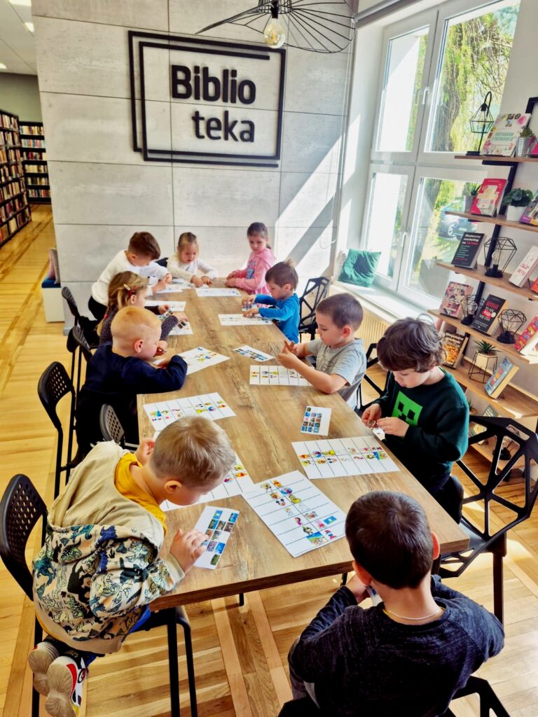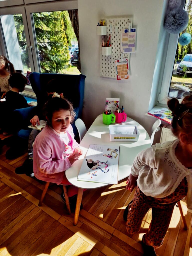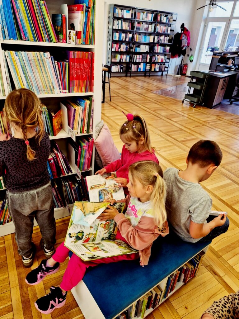 Wspólnie poznaliśmy zasady obowiązujące w bibliotece 📚🤫, przeczytaliśmy książkę 📘📖 oraz wykonaliśmy zadanie sprawdzające znajomość bajkowych postaci 🧚♀️🧞♂️. Na zakończenie dzieci miały też chwilę na swobodne zapoznanie się z księgozbiorem dla najmłodszych 📚👀✨.